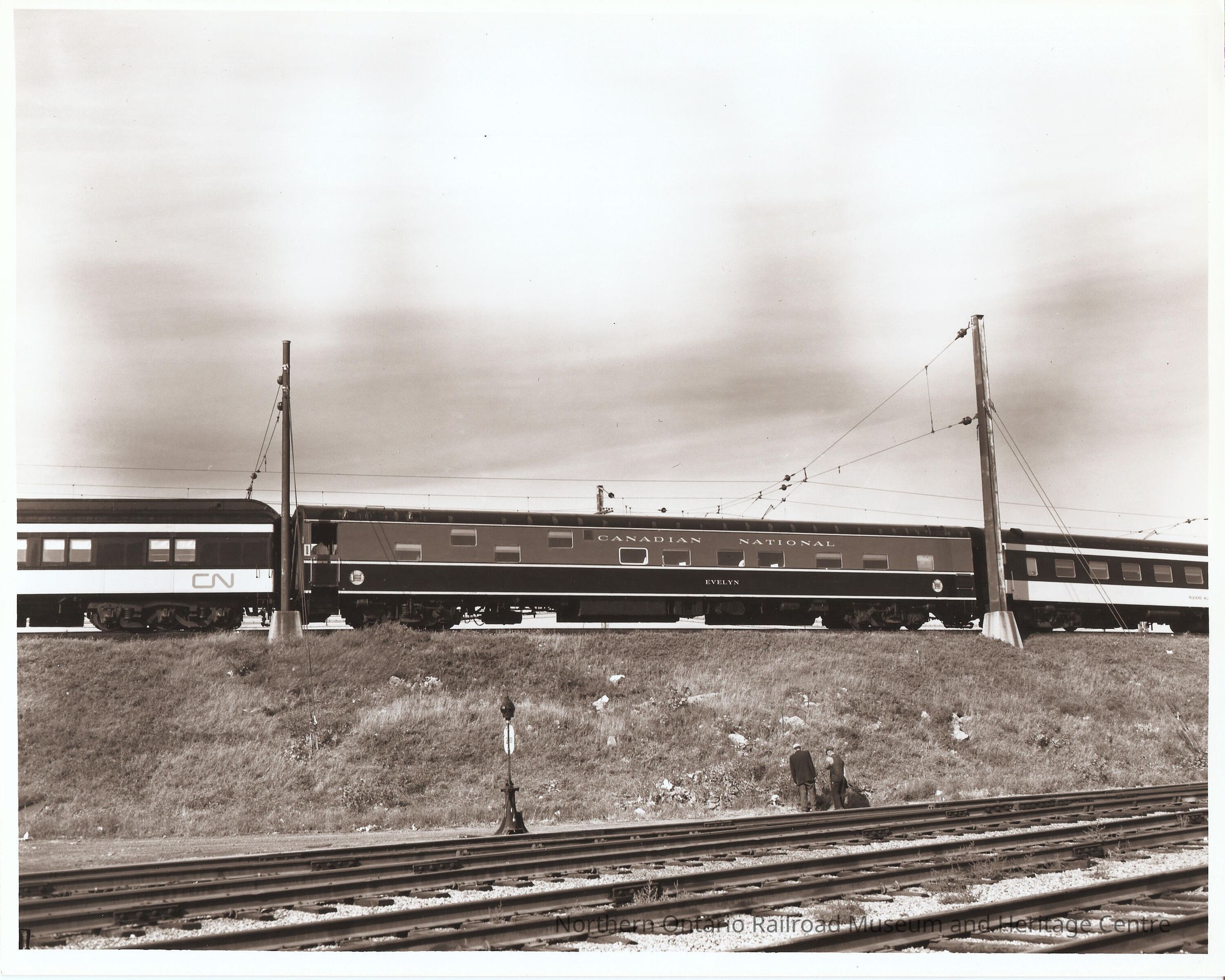 Black and white photograph of Canadian National passenger car no. 1157 with the word "EVELYN" stenciled on the side. Two men are facing the grassy knoll at its base. Montreal, Quebec.Collection
