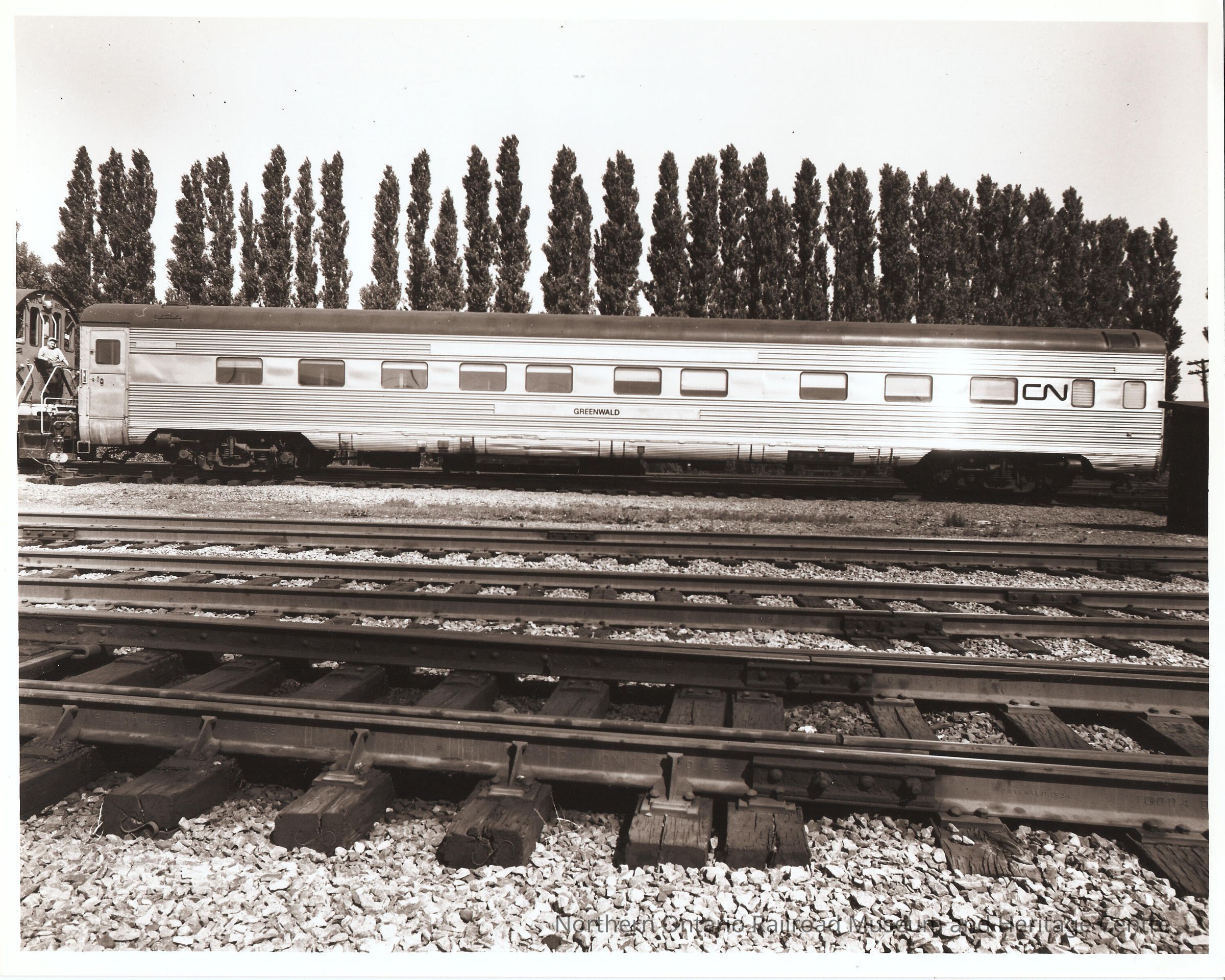 Black and white photograph of Canadian National steel passenger car no. 1195. "GREENWALD" is painting on a sign and attached to the side of the car.Collection