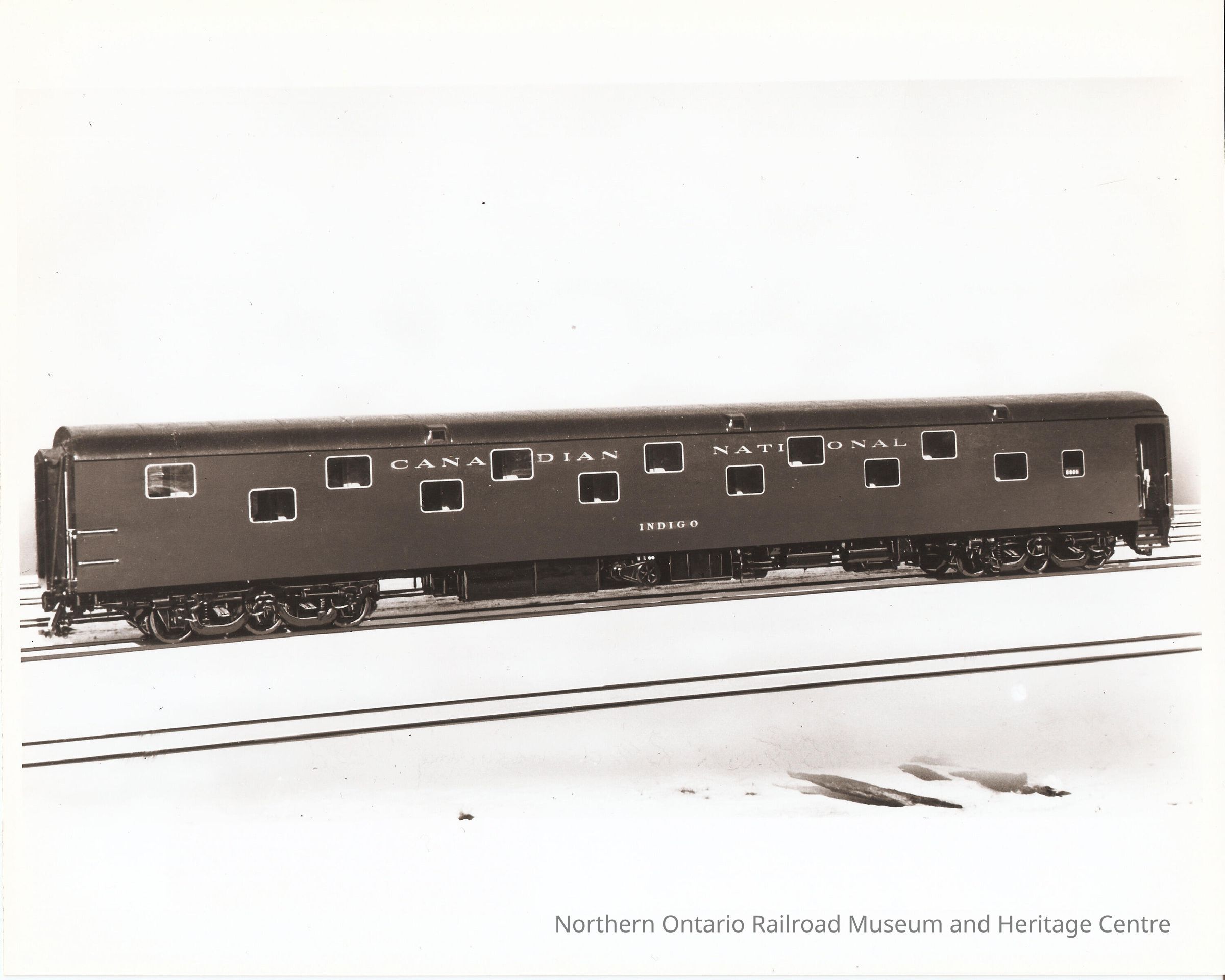 Black and white photograph of Canadian National passenger car no. 2000. "CANADIAN NATIONAL" and "INDIGO" are stenciled on the side of the car.Collection