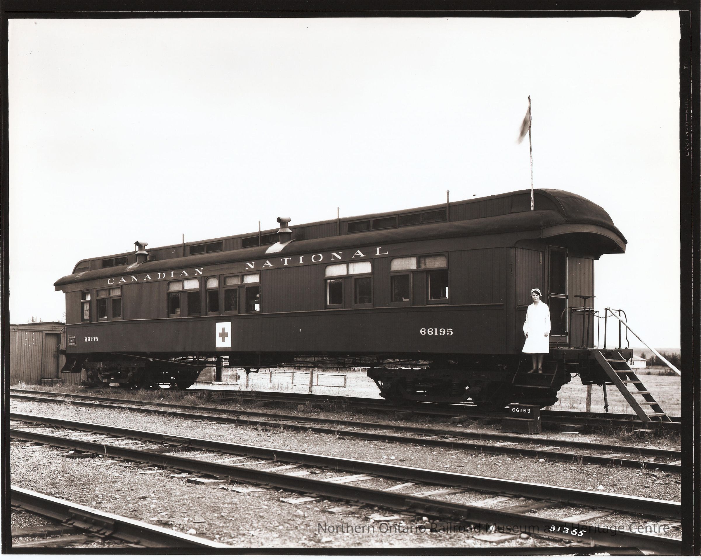 Black and white photograph of Canadian National Red Cross medical car no. 66195. A nurse is standing on the steps leading to the observation platform. A cross in a white square is stenciled on the side of the car.Collection