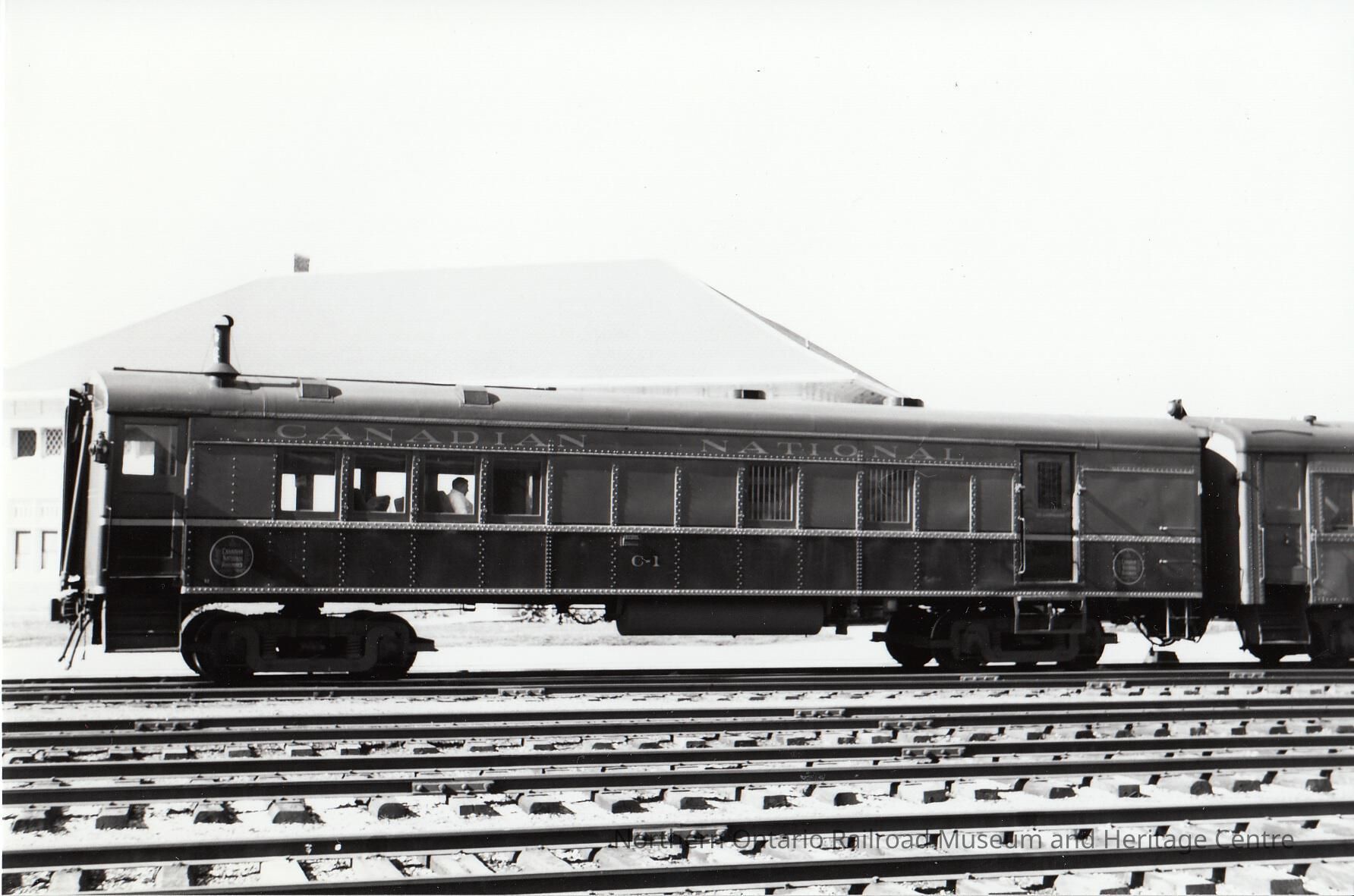 Black and white photograph of Canadian National passenger car C-1. Round Canadian National Railways logo in front of a maple leaf on side of car.