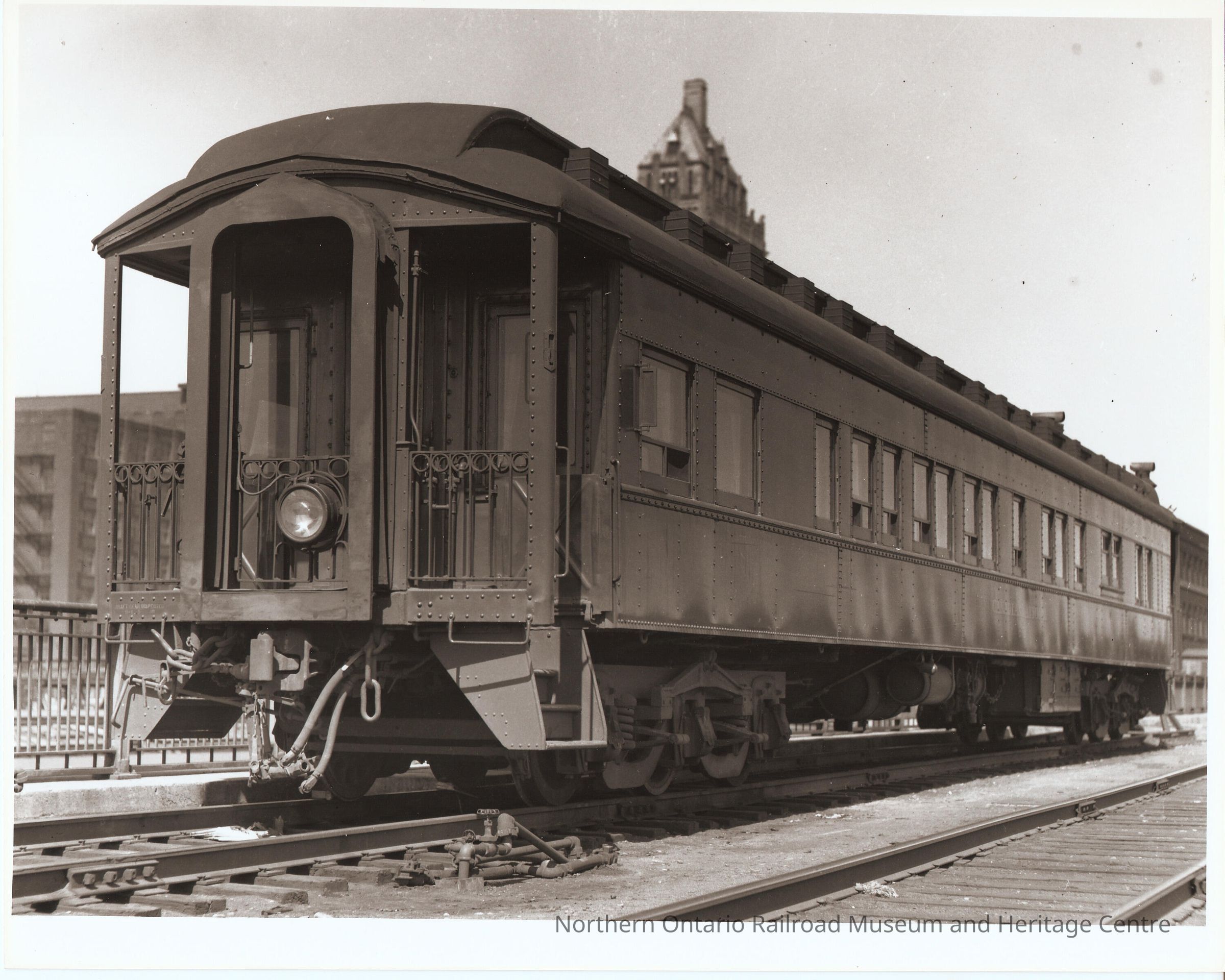 Black and white photograph of Canadian National passenger car no. 60 with an enclosed observation platform. In a Toronto rail yard. The Royal York Hotel can be seen in the background above the car.Collection