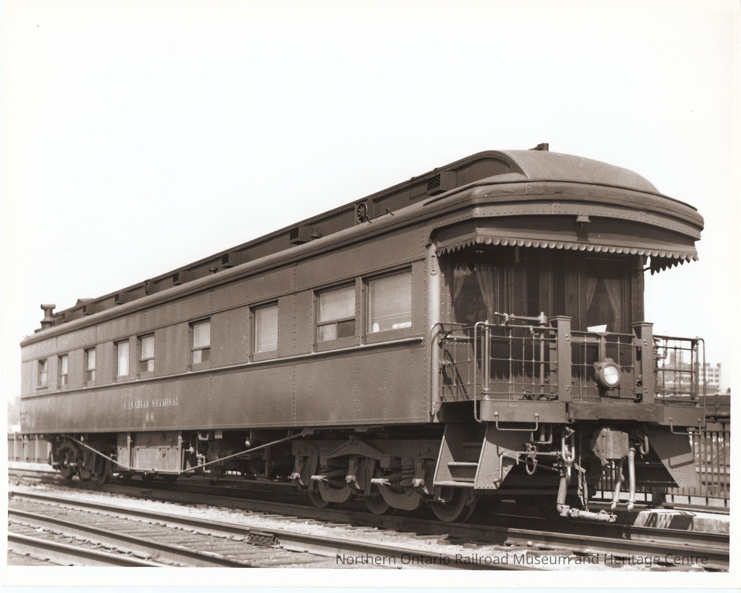 Black and white photograph of Canadian National passenger car no. 66 with observation platform.Collection