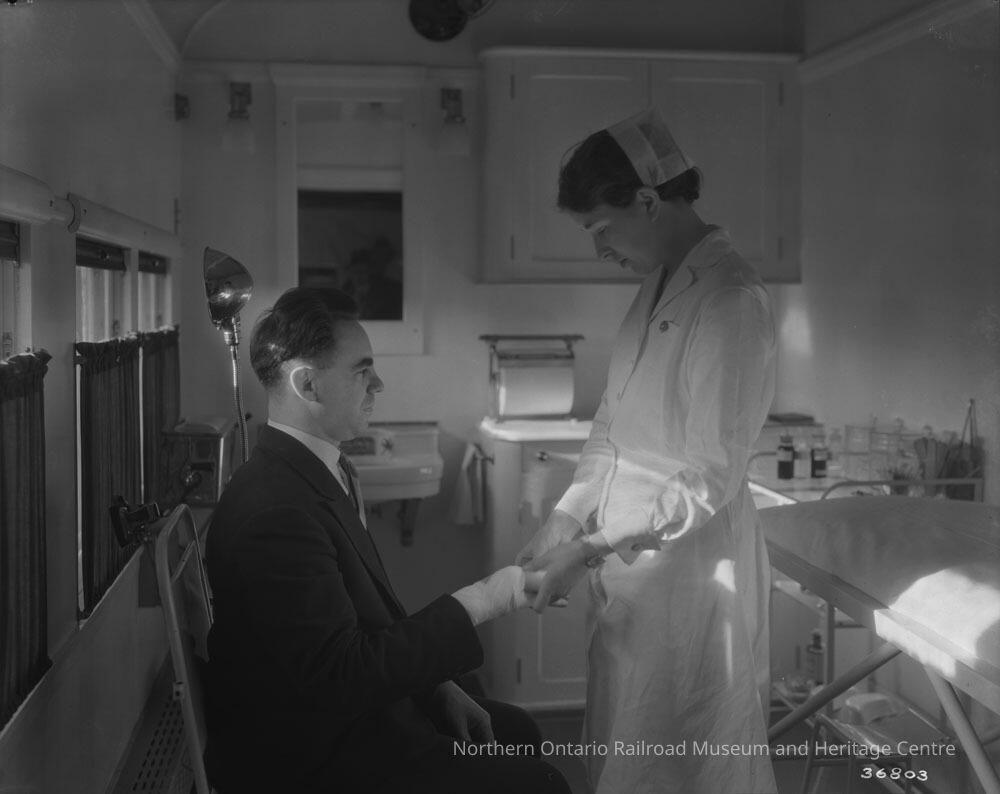Photograph, Canadian National Railways (CNR) Medical Clinic Car - patient receiving treatment.Collection