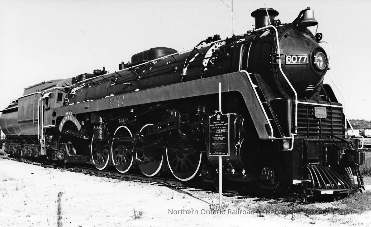 Locomotive No. 6077 was purchased by Canadian National Railways in 1944 along with 19 sisters. They were the last steam locomotives purchased by the company. Locomotive No. 6077 was saved, and gifted to Capreol by Canadian National Railways in 1967. It is on display in Prescott Park, now part of the Northern Ontario Railroad Museum and Heritage Centre.Collection