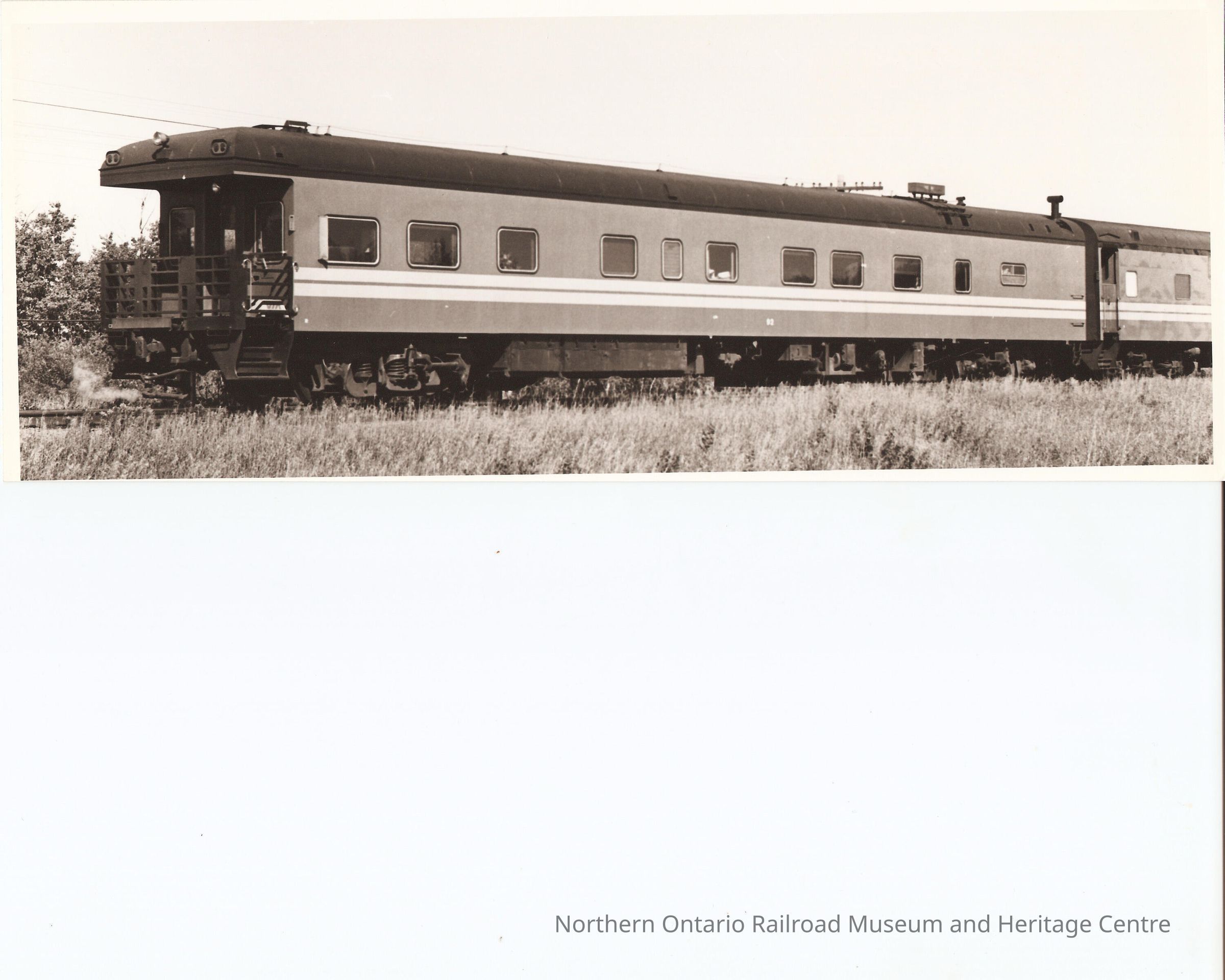 Black and white photograph of CN Super Continental business car no. 92 at Knox, Manitoba.Collection