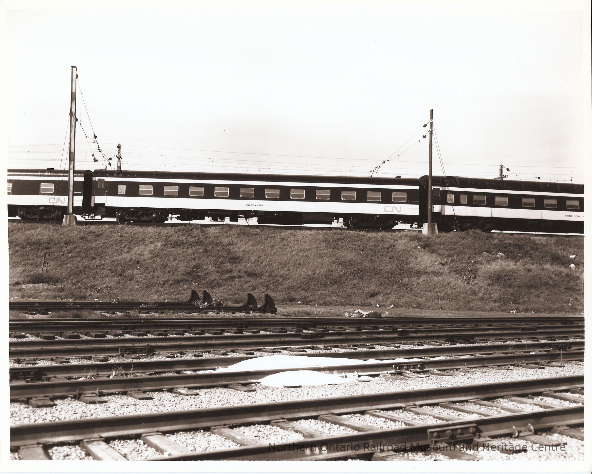 Black and white photograph of Canadian National passenger car no. 2074 with the words "VAL ST. MICHEL" stenciled on the side. Montreal, QuebecCollection