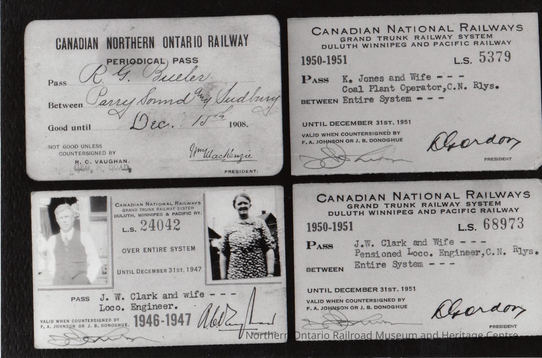 Black and white- A photograph of four periodical passes. The first belonged to R.G. Bueler, and was issued by the Canadian Northern Ontario Railway for service between Parry Sound and Sudbury, with an expiration date of December 15th, 1908. The second, issued by Canadian National Railways was for K. Jones and his wife, for the entire system, good until December 31st, 1951. The third, issued by Canadian National Railways, was for J.W. Clark and his wife, for the years 1946 and 1947. The fourth, also issued by Canadian National Railways, was for J.W. Clark and his wife, for 1950-1951.Collection