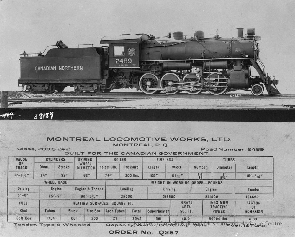 Photograph, Canadian Northern Railway Locomotive No. 2489, with particulars by Montreal Locomotive Works Limited.Collection