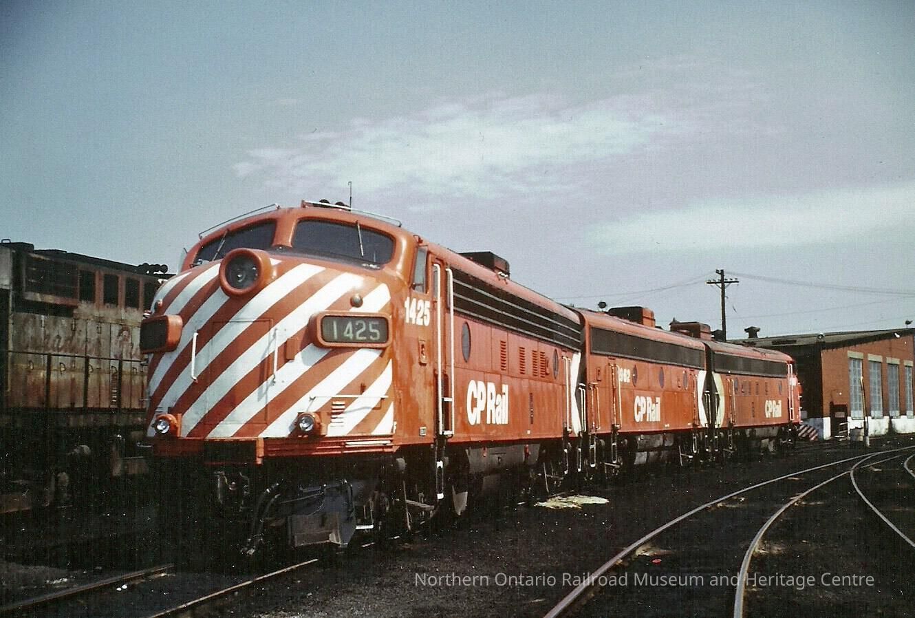 Color photograph of Canadian Pacific locomotive no. 1425 in a railroad yard.Context