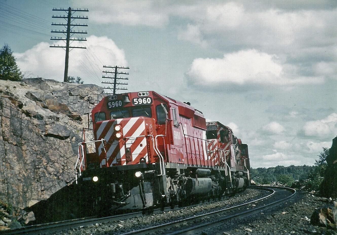 Color photograph of Canadian Pacific locomotive no. 5960 on the track, going around a bend. Rock cut on the left side of the image.Context