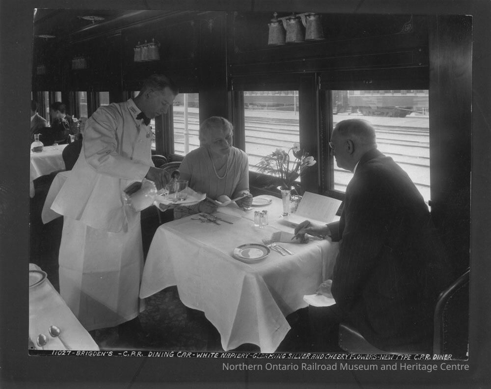 Photograph, Canadian Pacific Railway dining car, white napiery, gleaming silver and cheery flowers, 1920's.Collection