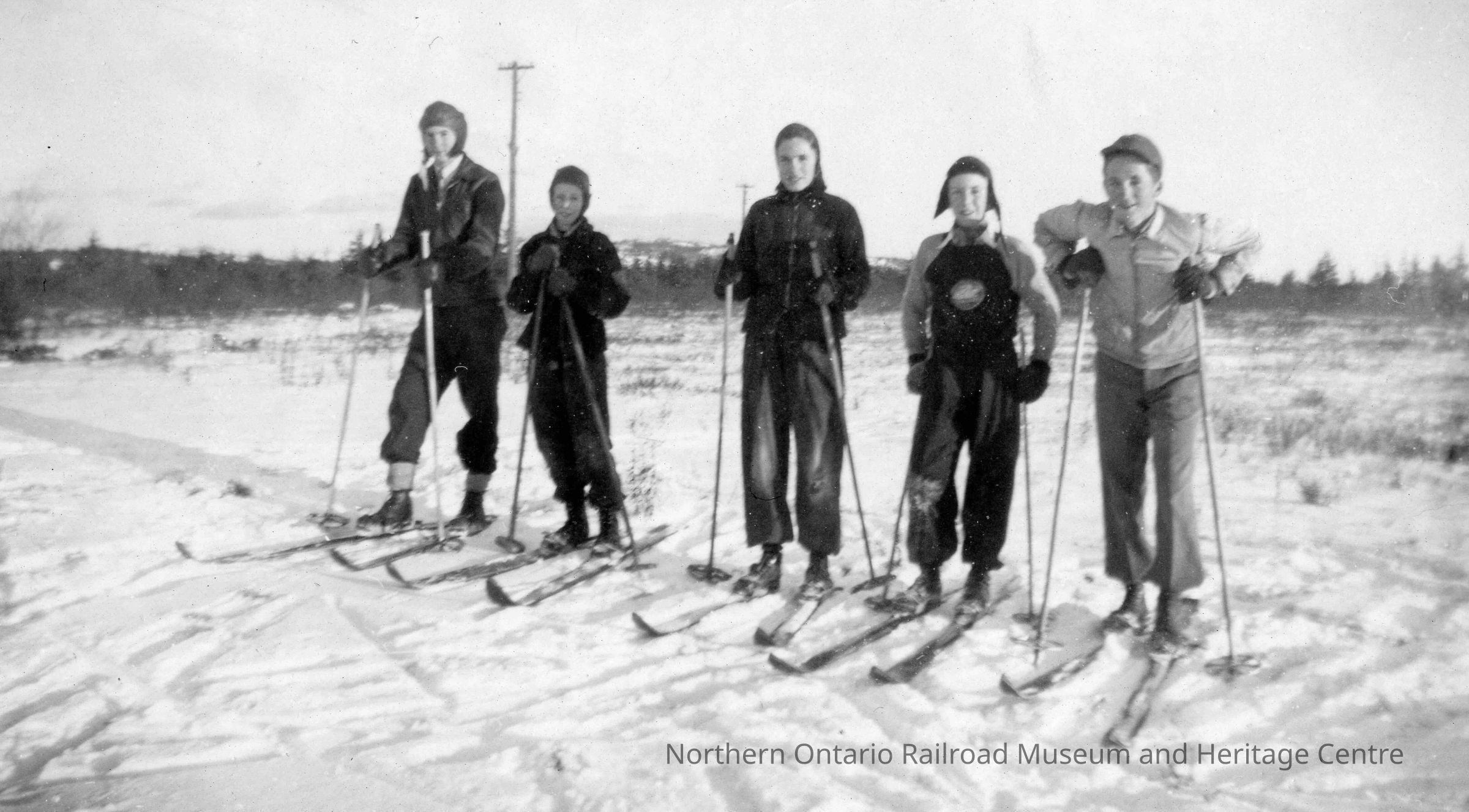 Photograph, Capreol Cross Country Skiiers, Left to Right are Allan Farquharson, Gerald Knapp, Frances Drake, Donald Judd, Gerald Gotty.Collection