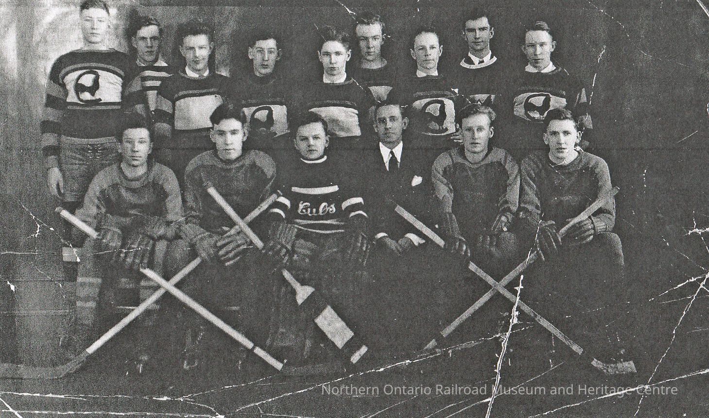 Black and white- The Capreol Cubs hockey team poses for a group photograph.