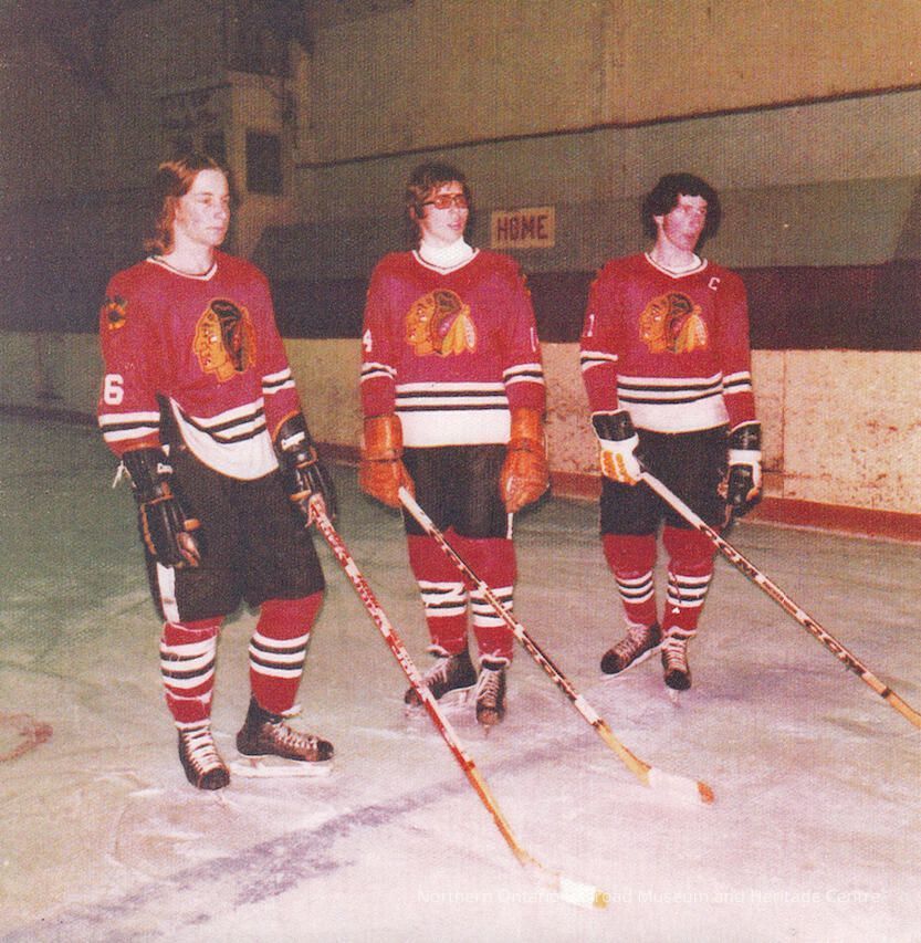 Colour- Three players, wearing the red jerseys of the Capreol Hawks, pose for a photograph on the ice.
