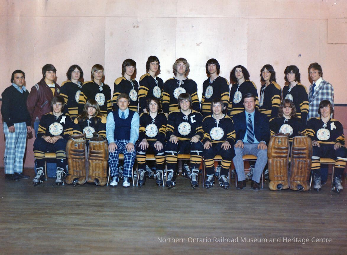 Front row (left to right:) Ricky Ross, Barry Foreman, Dave Colasimone (coach), Jim Ryan, Jim Hanzel, Lyle Blanchard, Bruce Miles (trainer), unknown, and Brian Thompson.Collection