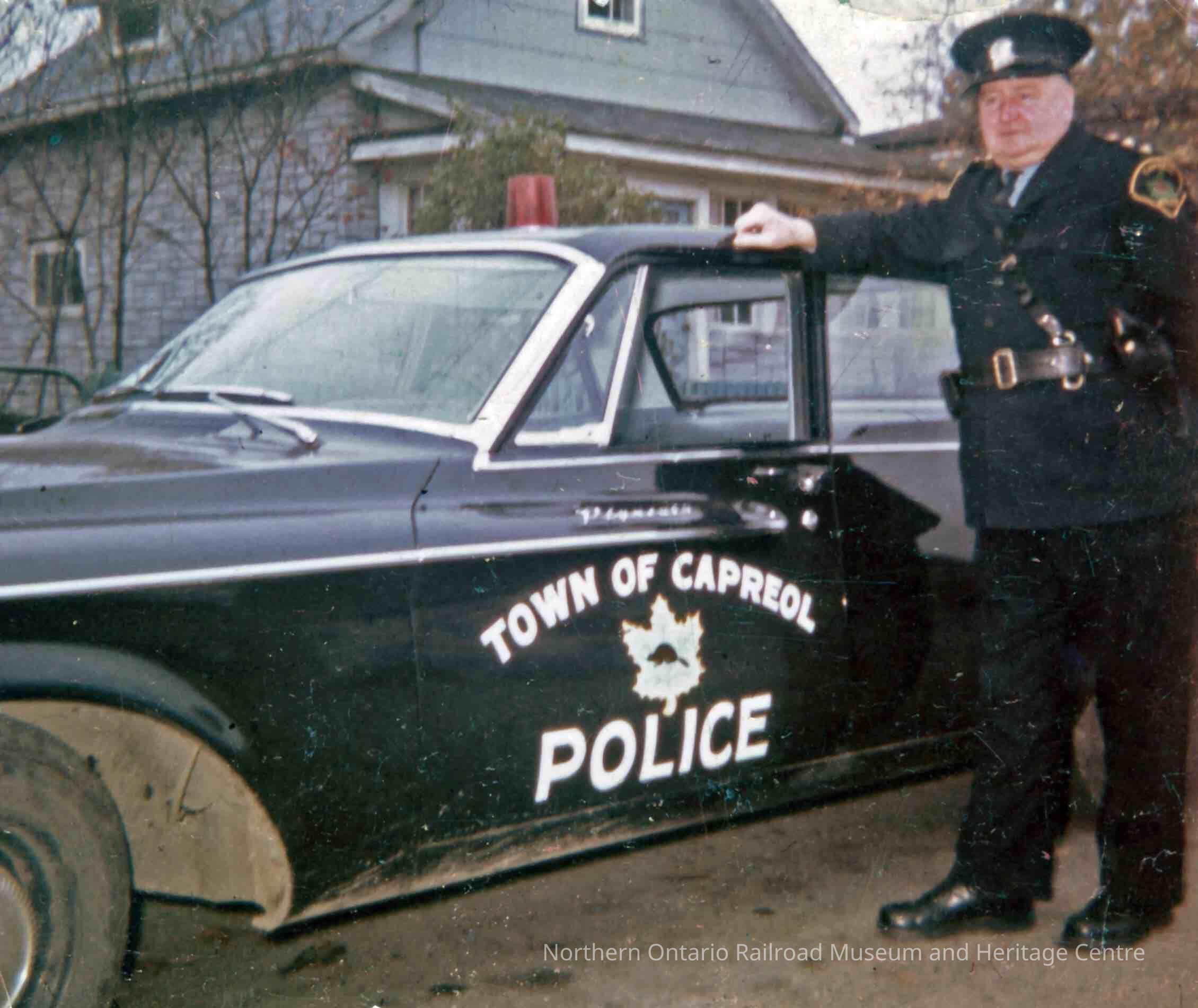 Photograph, Capreol Police Chief Alex MacAtee, 1962 Plymouth Belvedere Police Car, Capreol, Ontario.Description