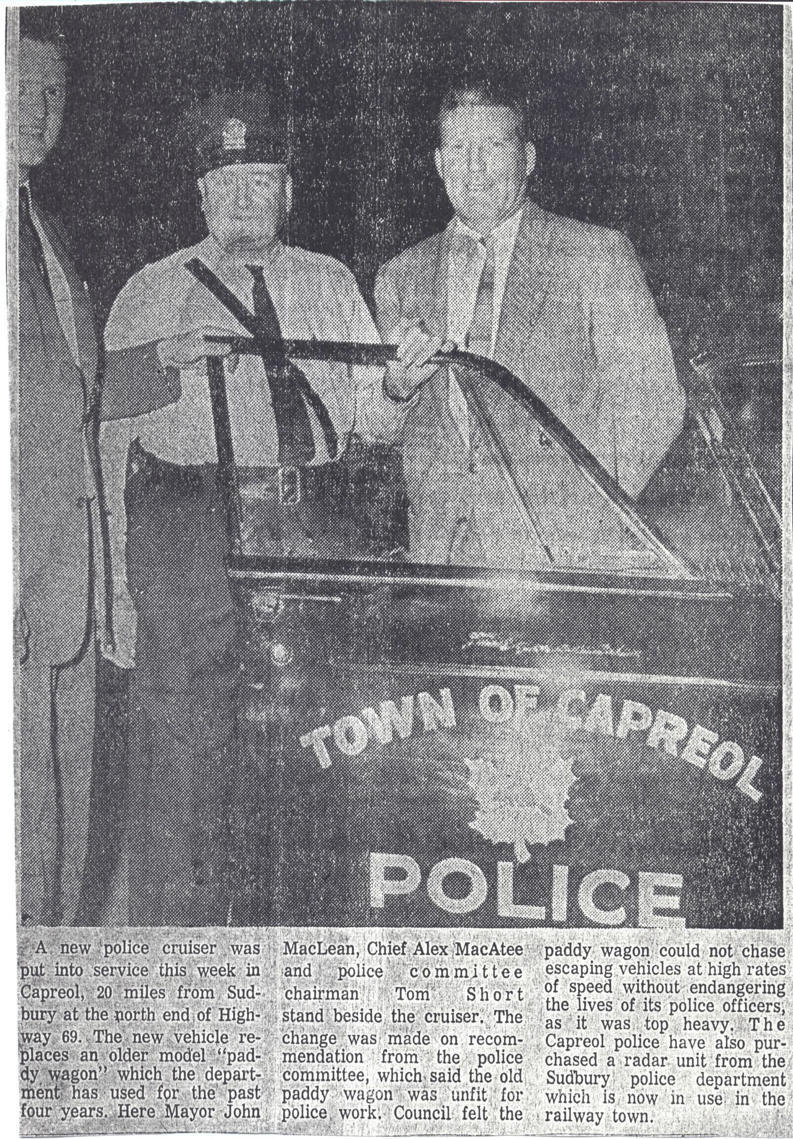 Photocopy of a newspaper article documenting the purchase of a new police cruiser by the Capreol Police Department. The accompanying photograph shows Mayor John MacLean, Police Chief Alex MacAtee and police committee chairman Tom Short standing behind the open door of the new vehicle.Collection