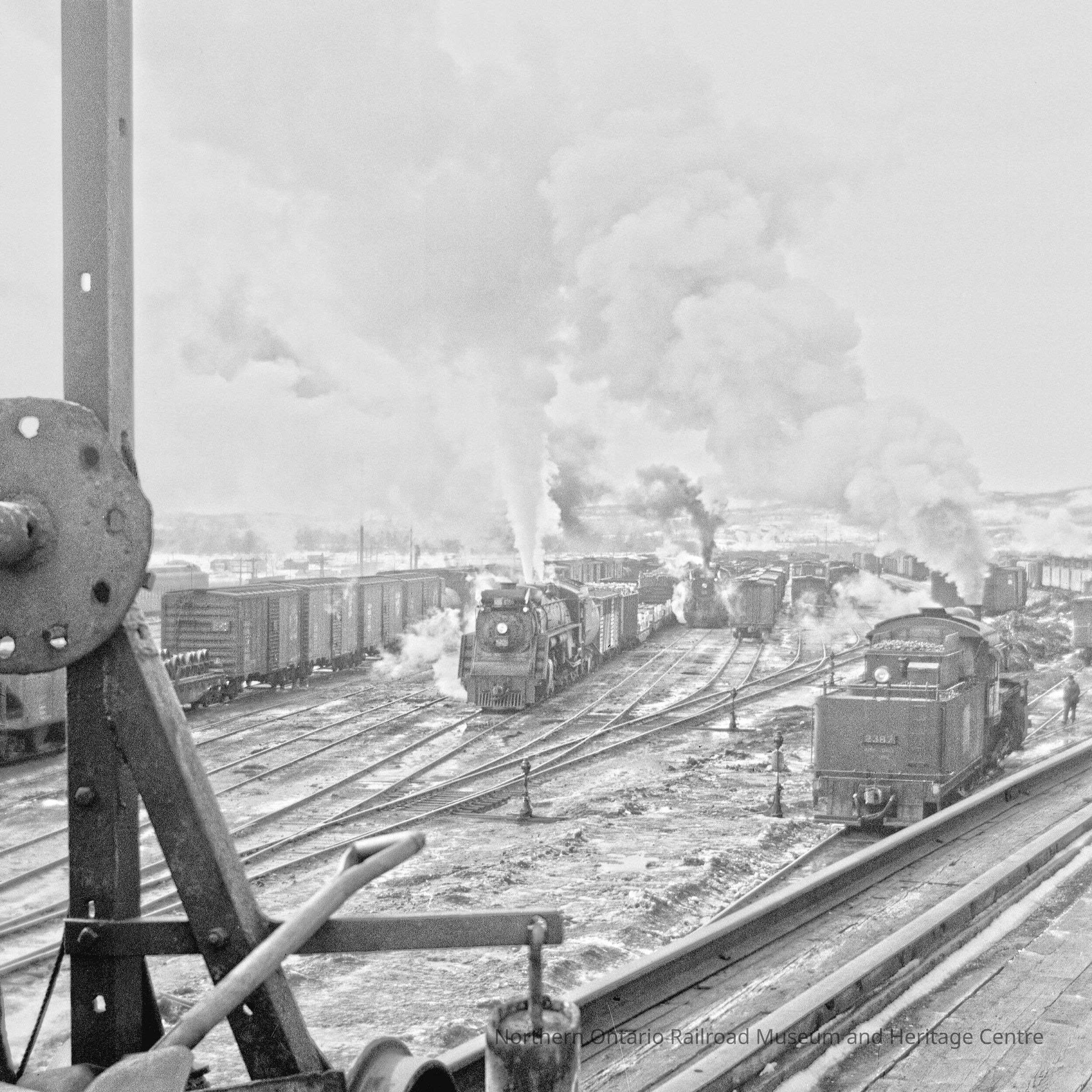 Digital reproduction of a black and white photograph of the Capreol rail yard
