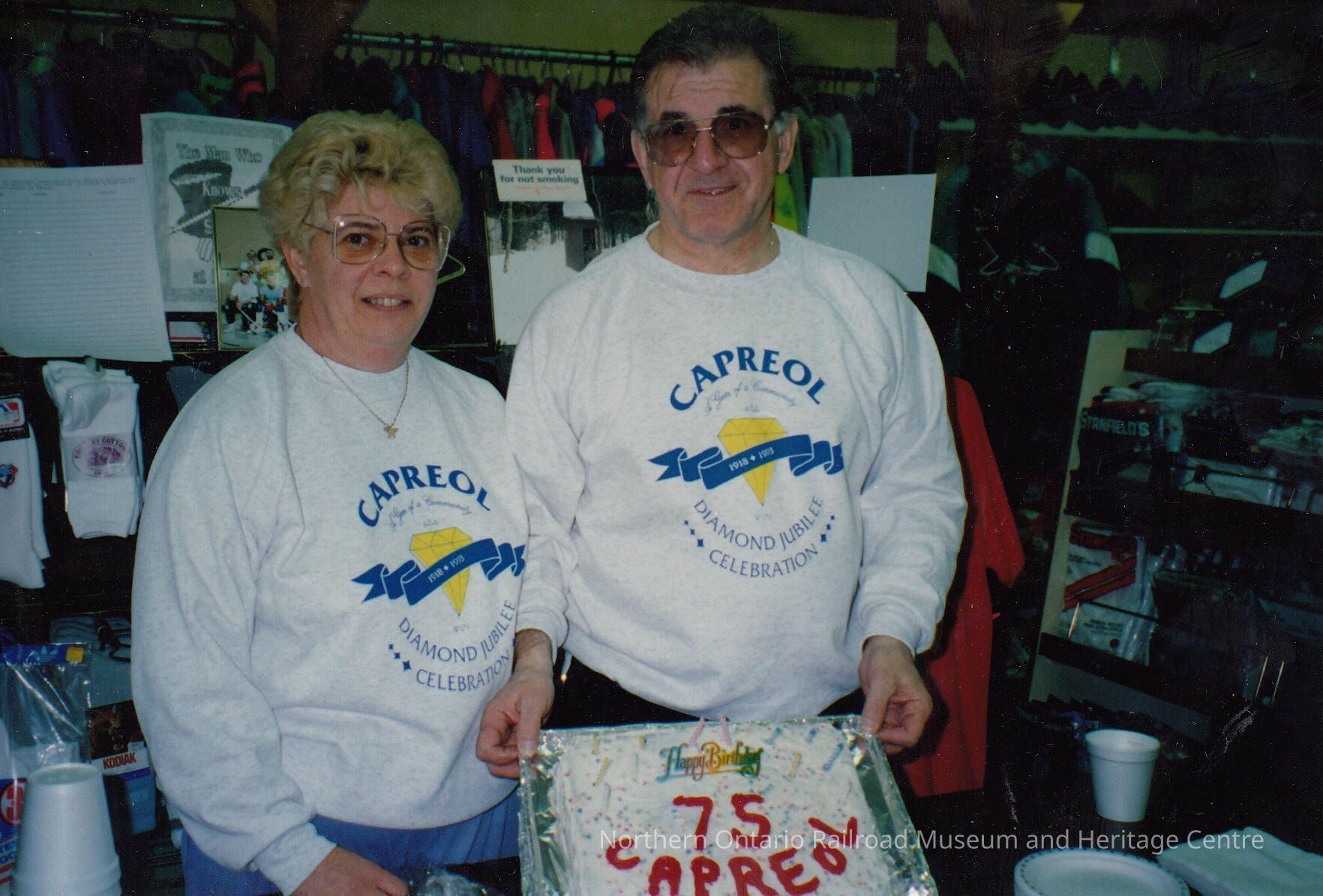 Colour- Rudy Mazzuca and Lynn Mazzuca, wearing sweaters commemorating Capreol's diamond jubilee, present a birthday cake for the town, that has the words "75 Capreol" written in red icing.Collection