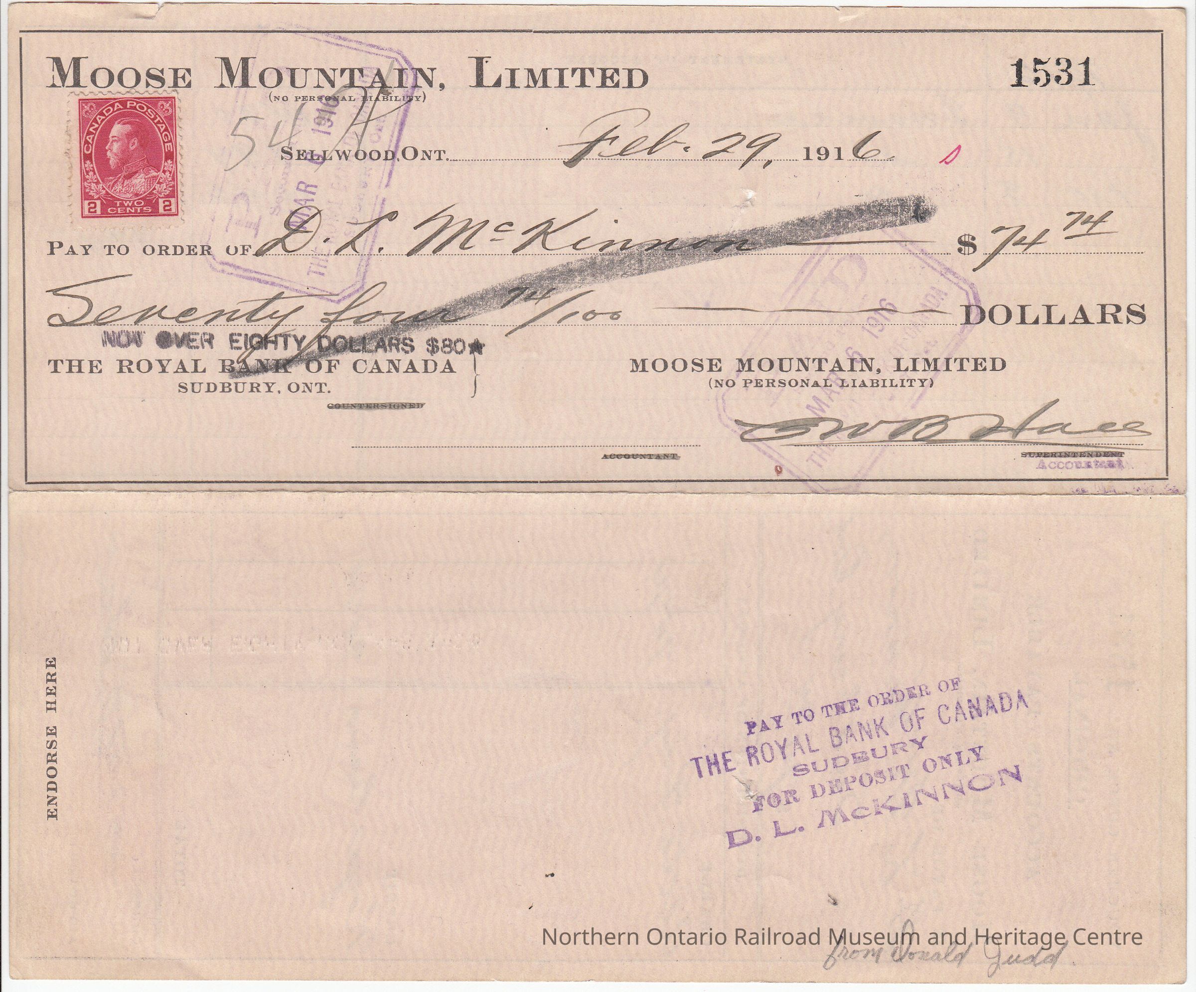 Photograph, Cheque, Moose Mountain Mine, Sellwood, Ontario.Collection