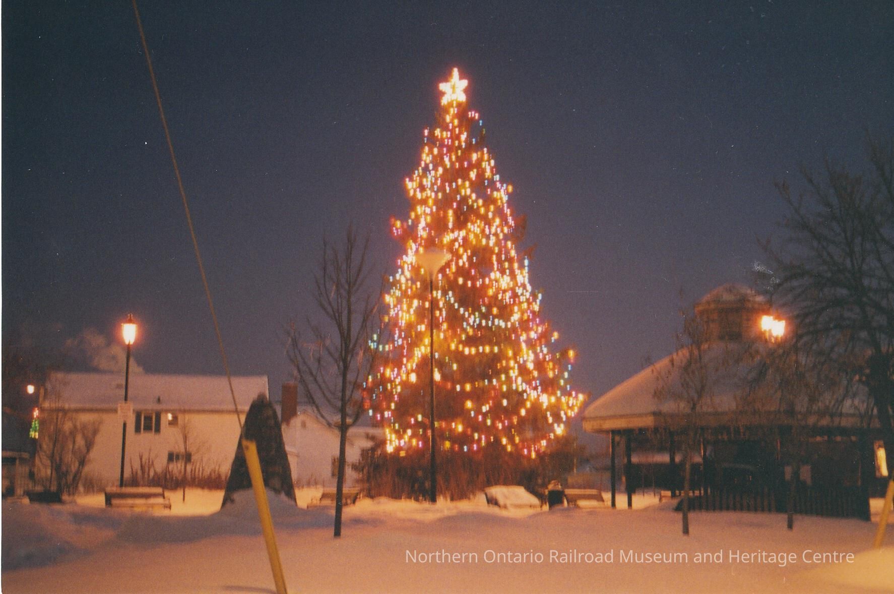 Colour photograph of a tree decorated with coloured lights and a star on top. Tree stands to the right of a gazebo. Ground is covered in snow. Photograph taken at night.