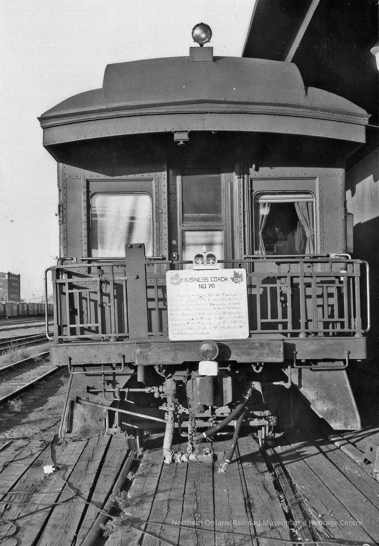 Black and white photograph of the back of CN business coach no. 76, showing the descriptive panel attached to the railing on the platform.Context