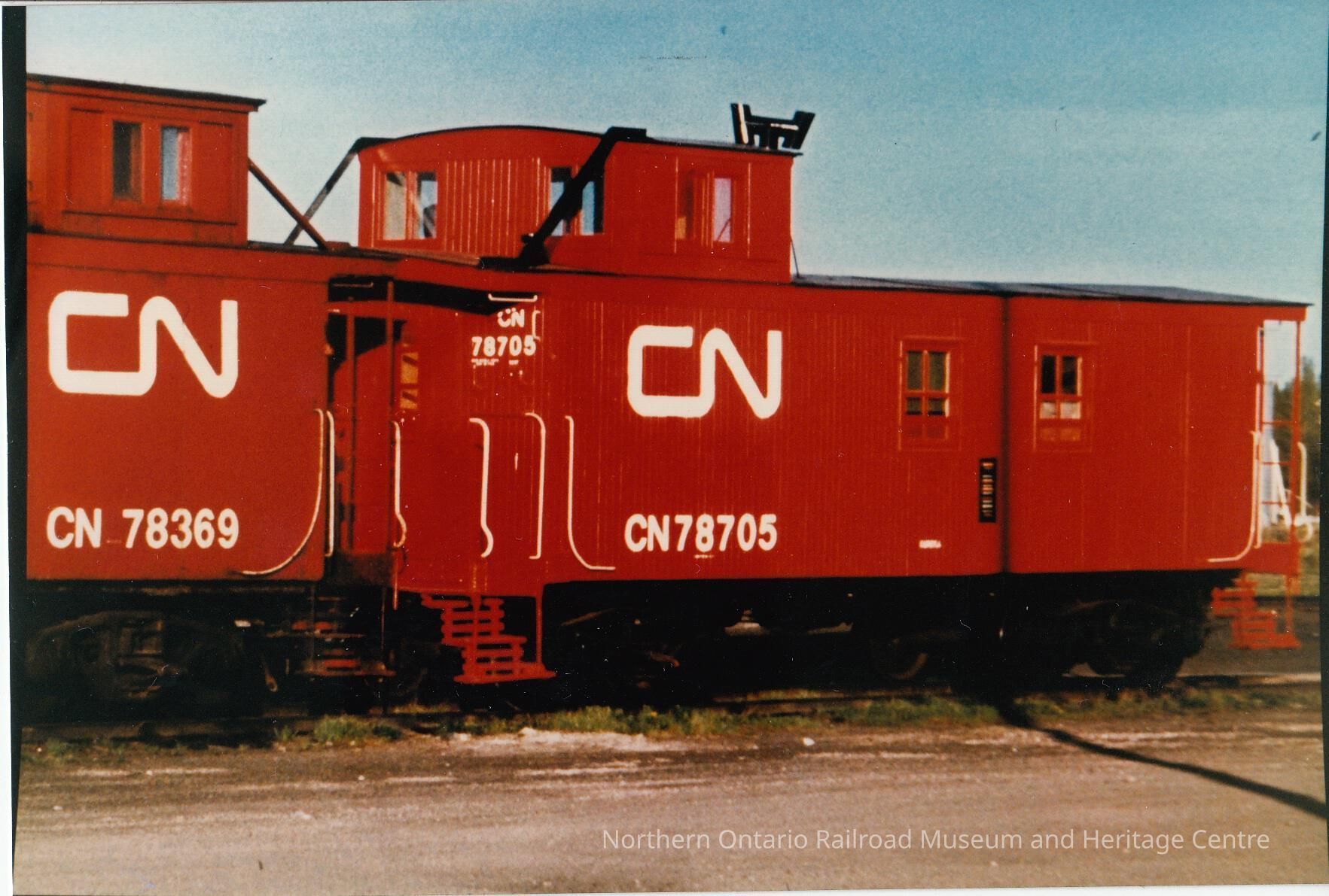 Colour- A photograph depicting CN cabooses no. 78705 and no. 78369, both painted bright red.Collection