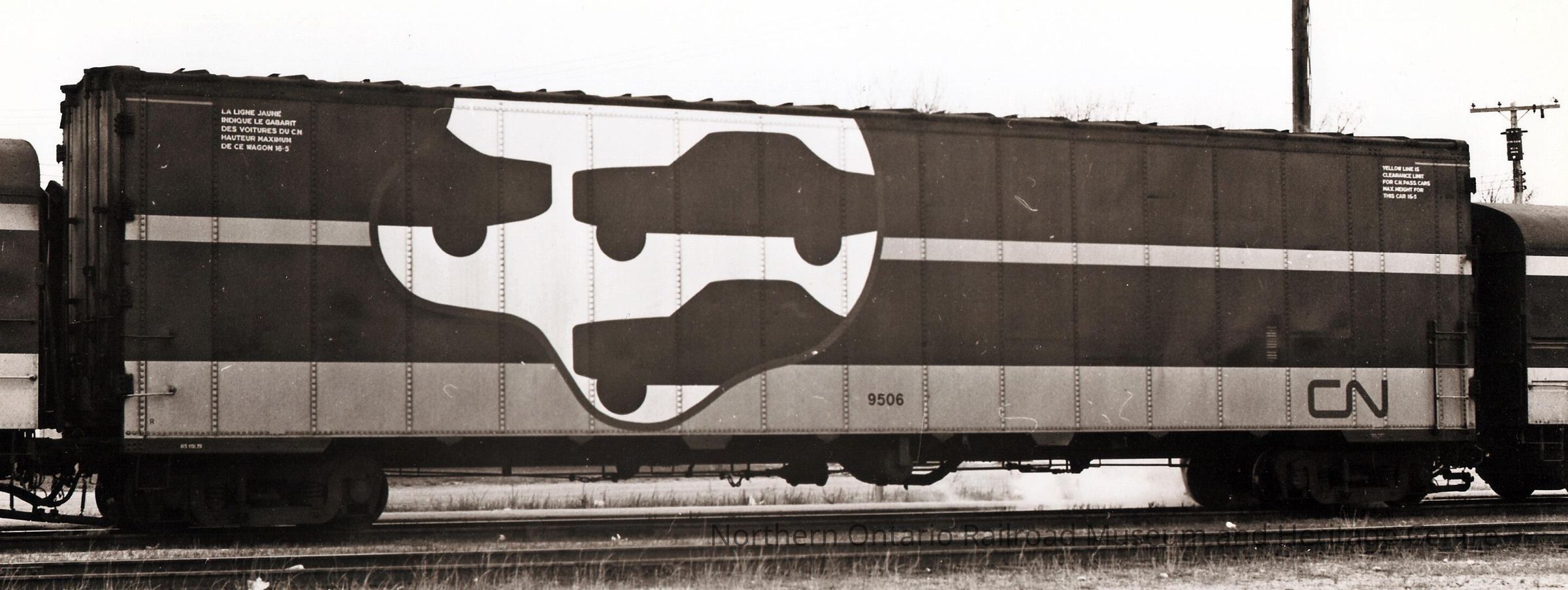 Black and white photograph of Canadian National Car-Go-Rail train no. 9506 on track #2.Context