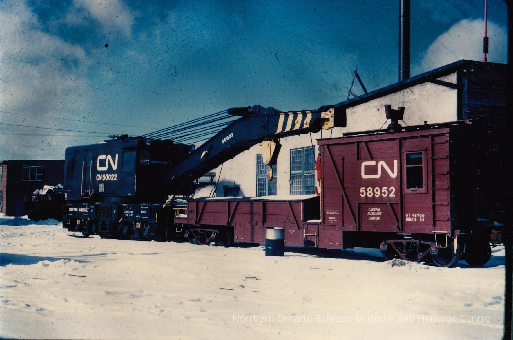 Colour- A photograph depicting CN. crane no. 50022 and CN auxiliary cabin car no. 58952 sitting in a rail yard, next to a white building.Collection