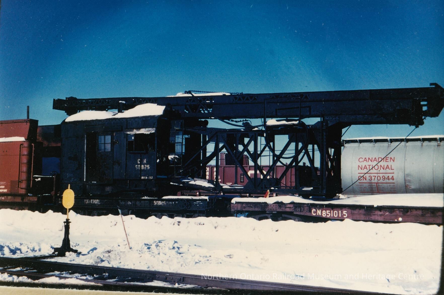 Colour- A photograph depicting CN. crane no. 50835 sitting in a snowy rail yard, painted black.Collection
