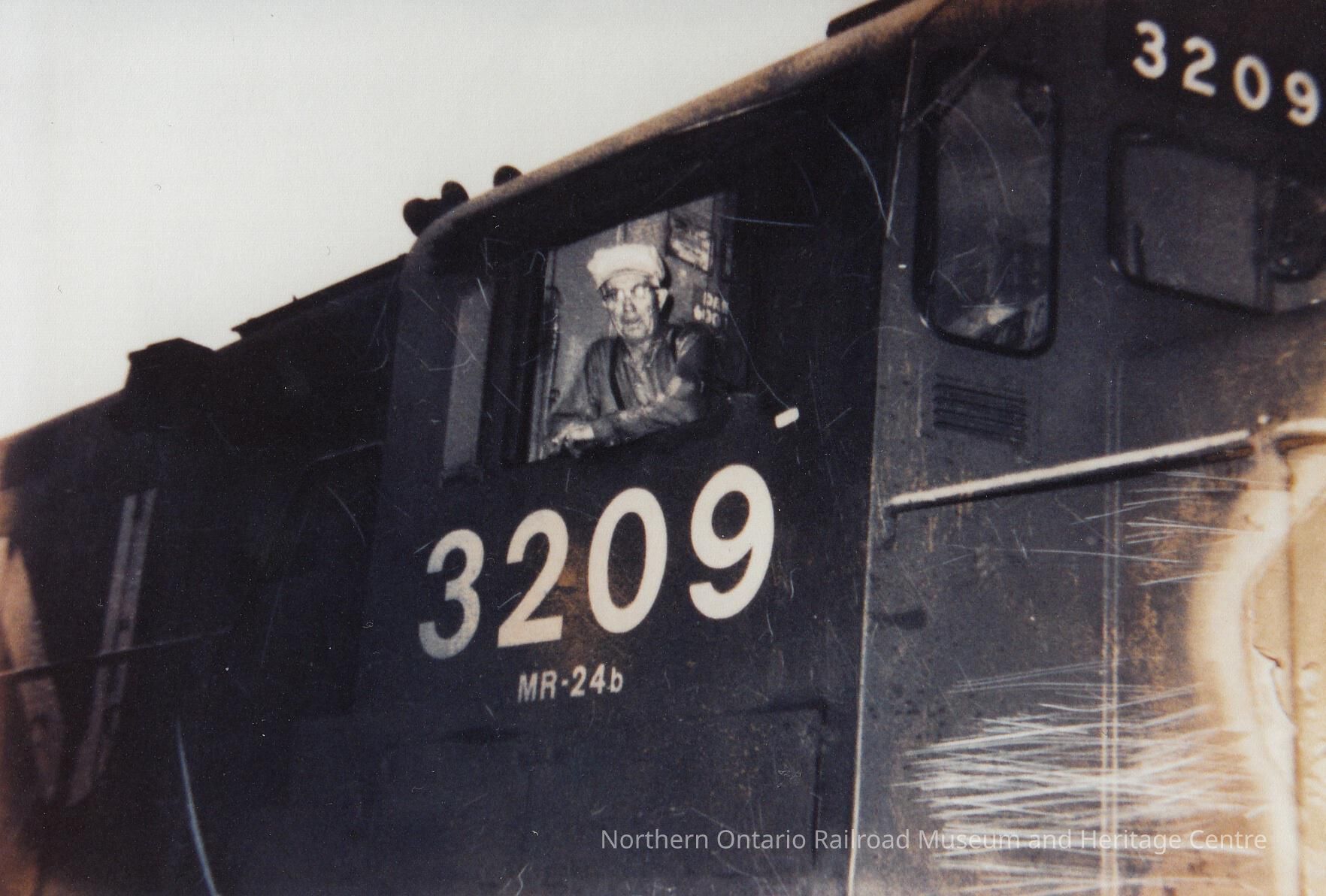 Black and white- A conductor leans out of the window of CN Engine no. 32o9.Collection