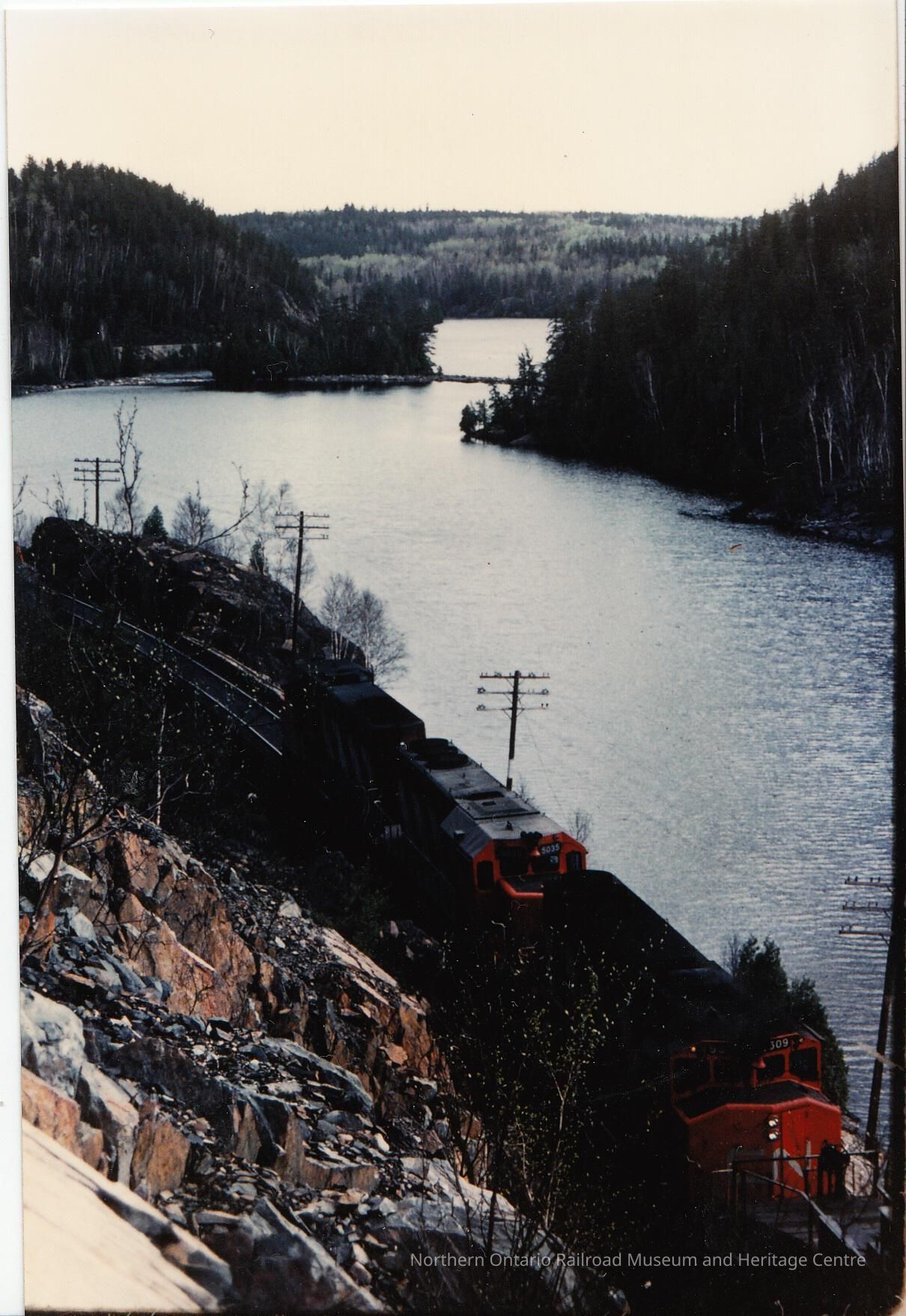 Colour- Engines no. 9309 and Engine no. 5035 travel on a rail track next to a river. The opposite bank is heavily forested.Collection