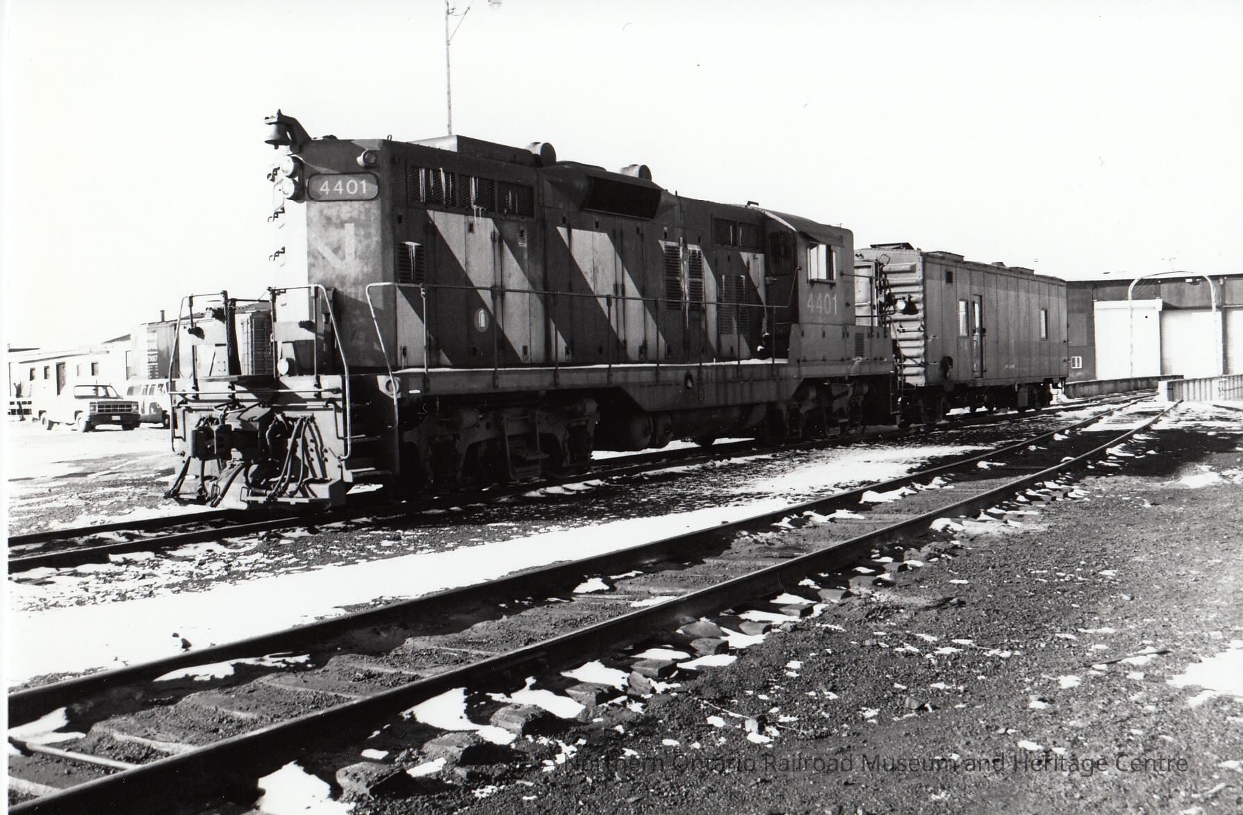 Black and white photograph of CN locomotive no. 4401 in front of a boxcar. Empty track to the right of the locomotive.