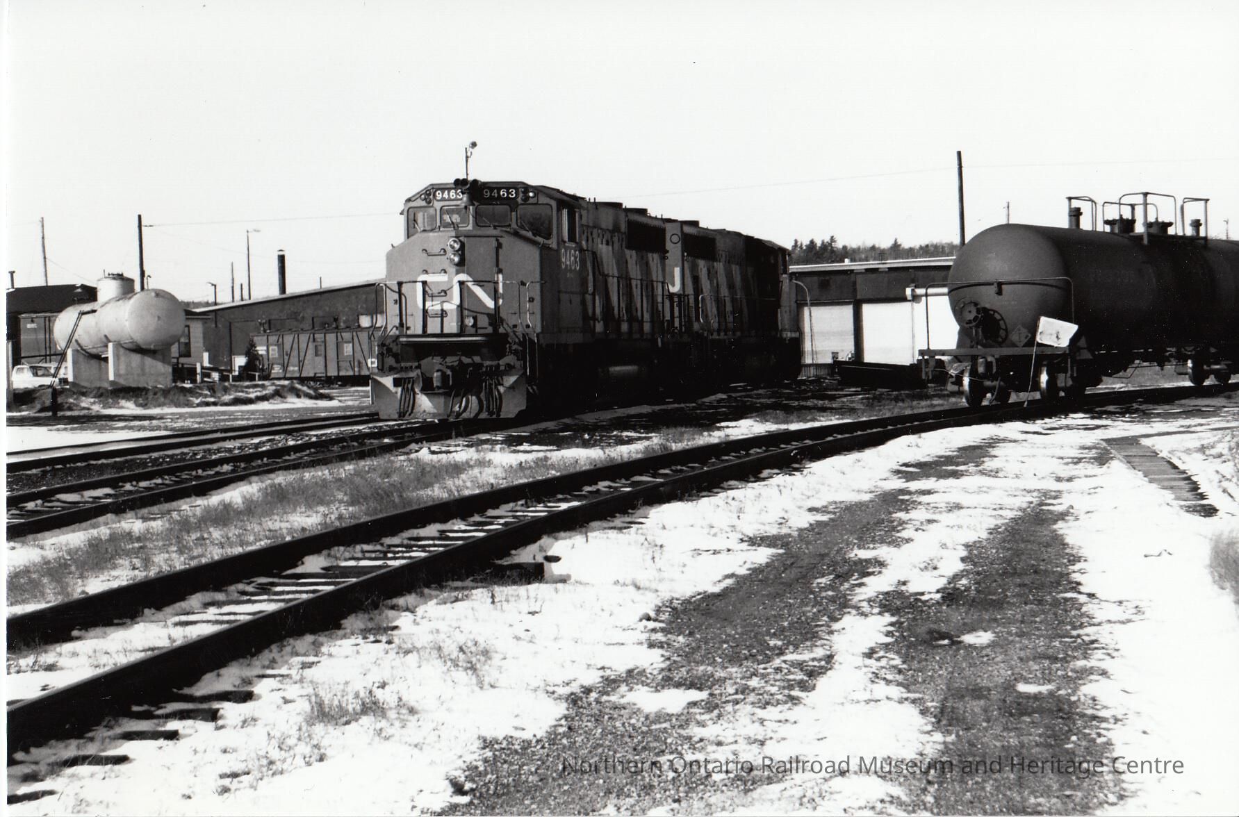 Black and white photograph of CN locomotive no. 9463 in a railyard. Tank car to the right of the locomotive.