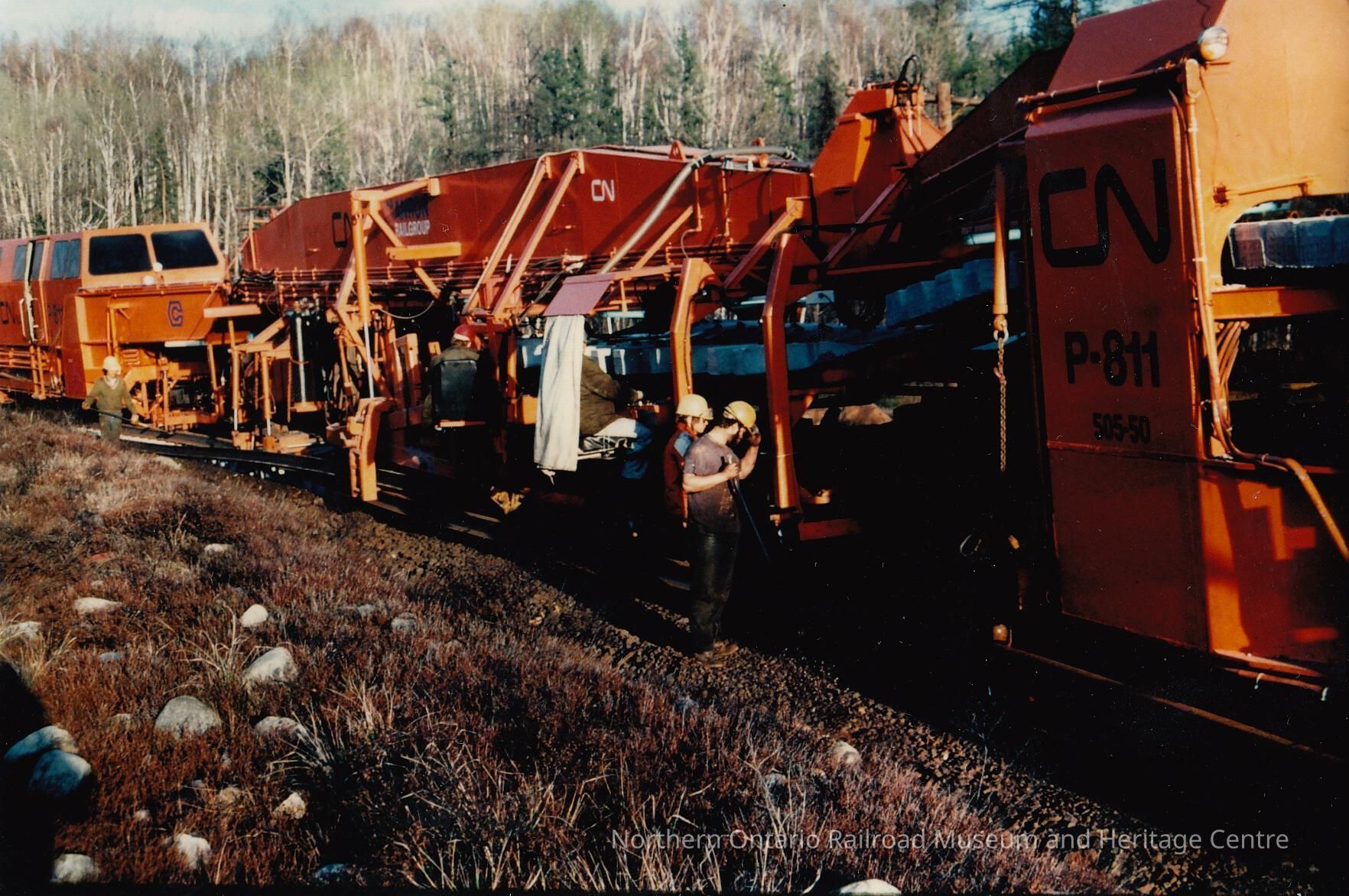 Colour- Two workers inspect a CN P-811 track layer.Collection