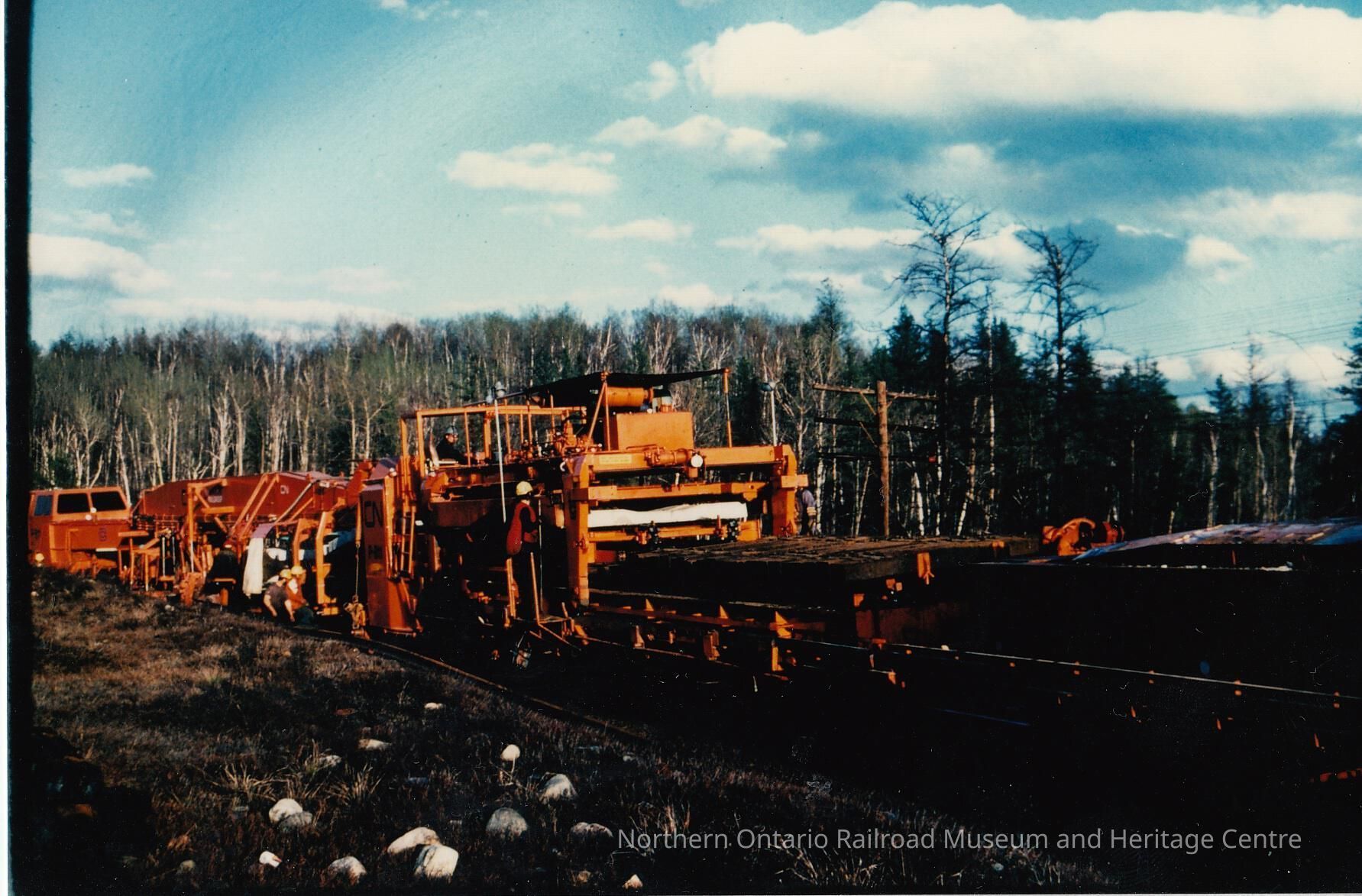 Colour- A photograph depicting a CN P-811 track laying machine, laying a stretch of track in the middle of a remote area.Collection