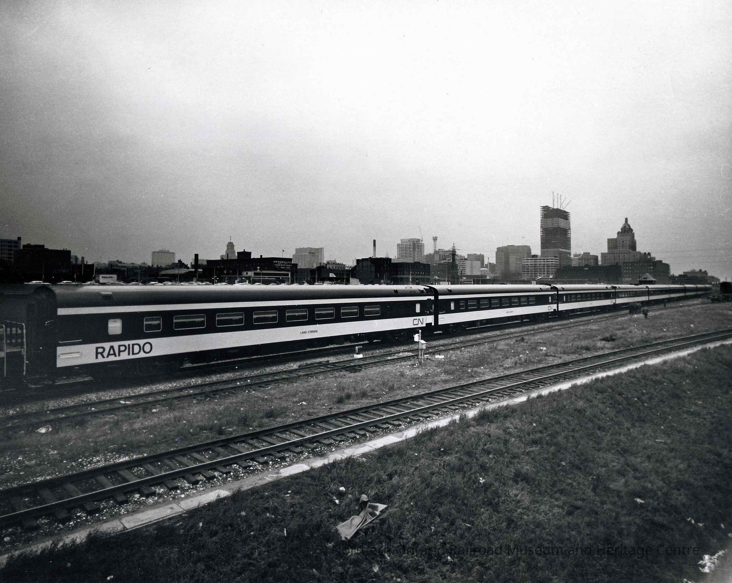 Black and white photograph of CN Rapido "Lake O'Brien" passenger train.Collection