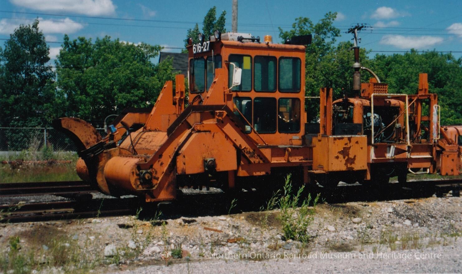 Colour photograph of a railroad snow remover, no. 616-27. Snow blower on the left end.