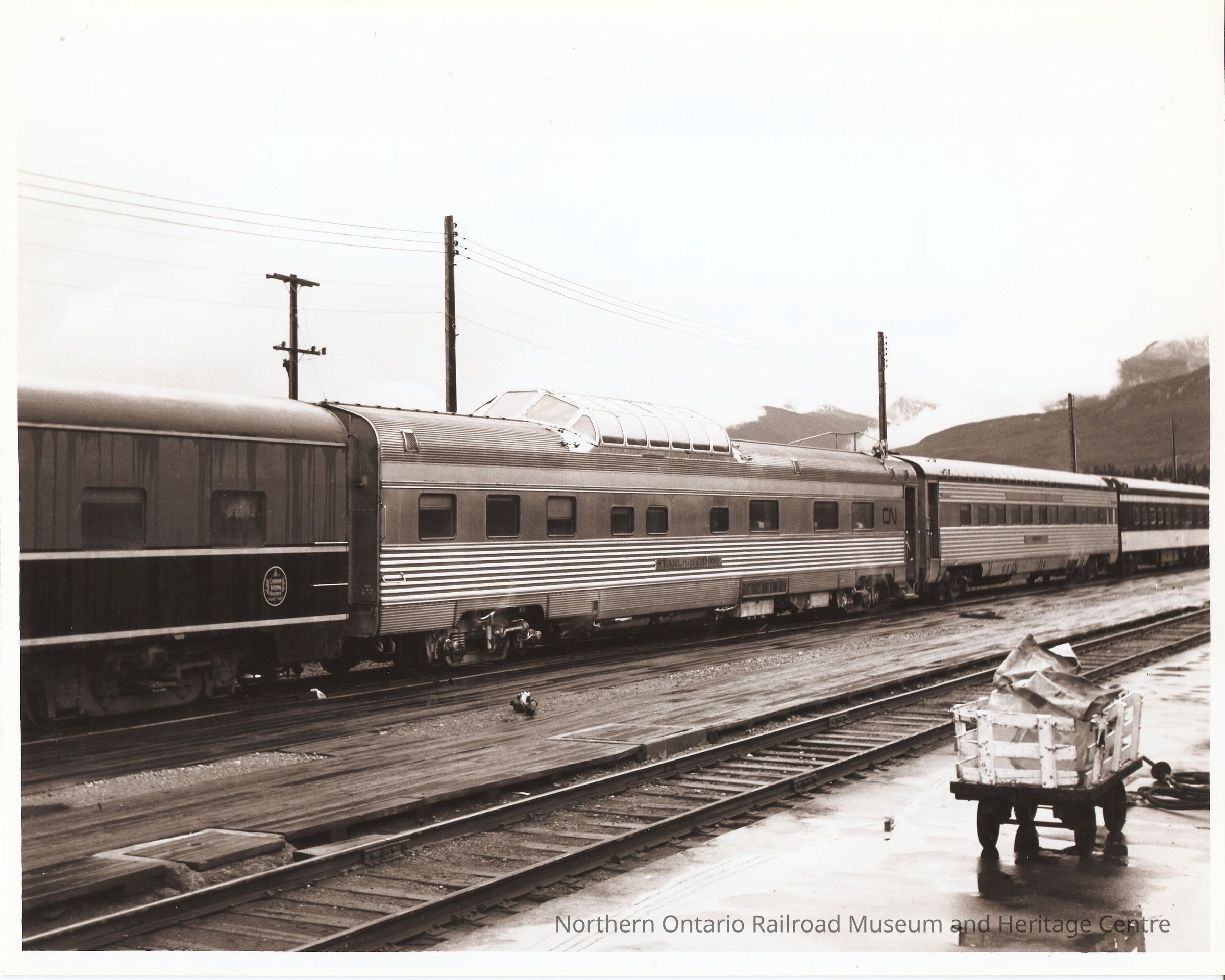 Black and white photograph of CN "Starlight Dome" car in a rail yard. Baggage cart is visible in the lower right corner.Collection
