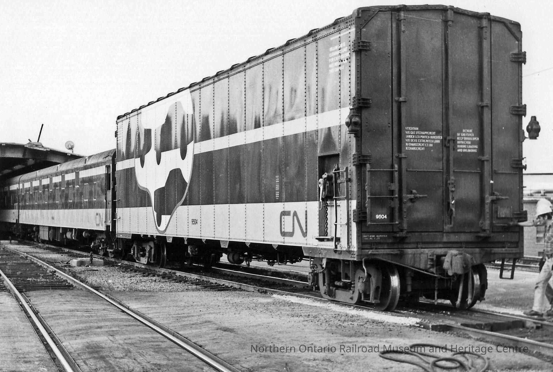 Black and white photograph of CN Super Continental passenger car attached to a freight or baggage car at the rear of the train. Last rail car is taller than the passenger car and is stenciled with the CN logo and a graphic of three automobiles. On track 4.Context