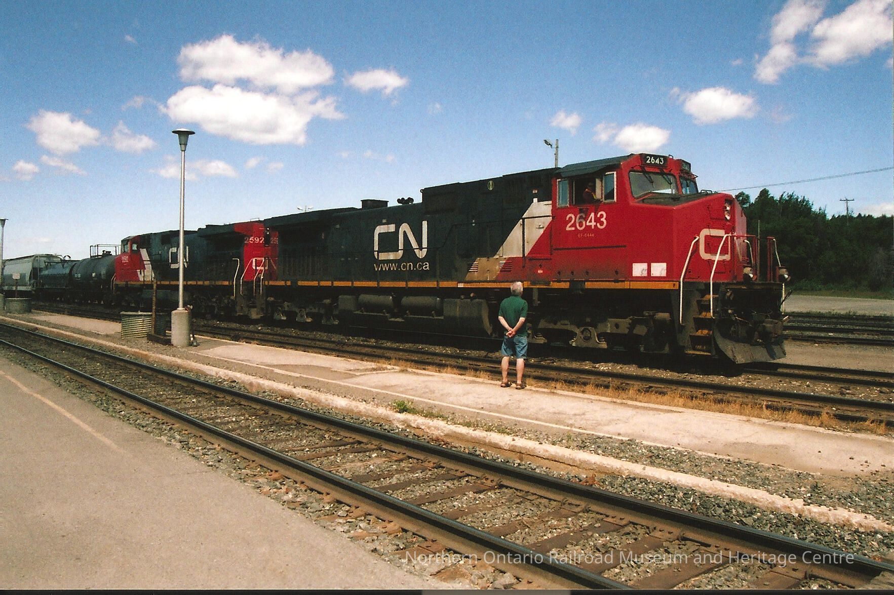Colour photograph of CN train with locomotive no. 2643. A man wearing a green t-shirt and denim shorts is looking up at the locomotive from the tracks.Collection
