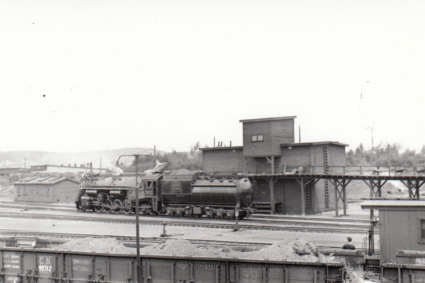Black and white photograph of the Canadian National Railways ice house in Capreol. Locomotive 3801 parked in front.Collection