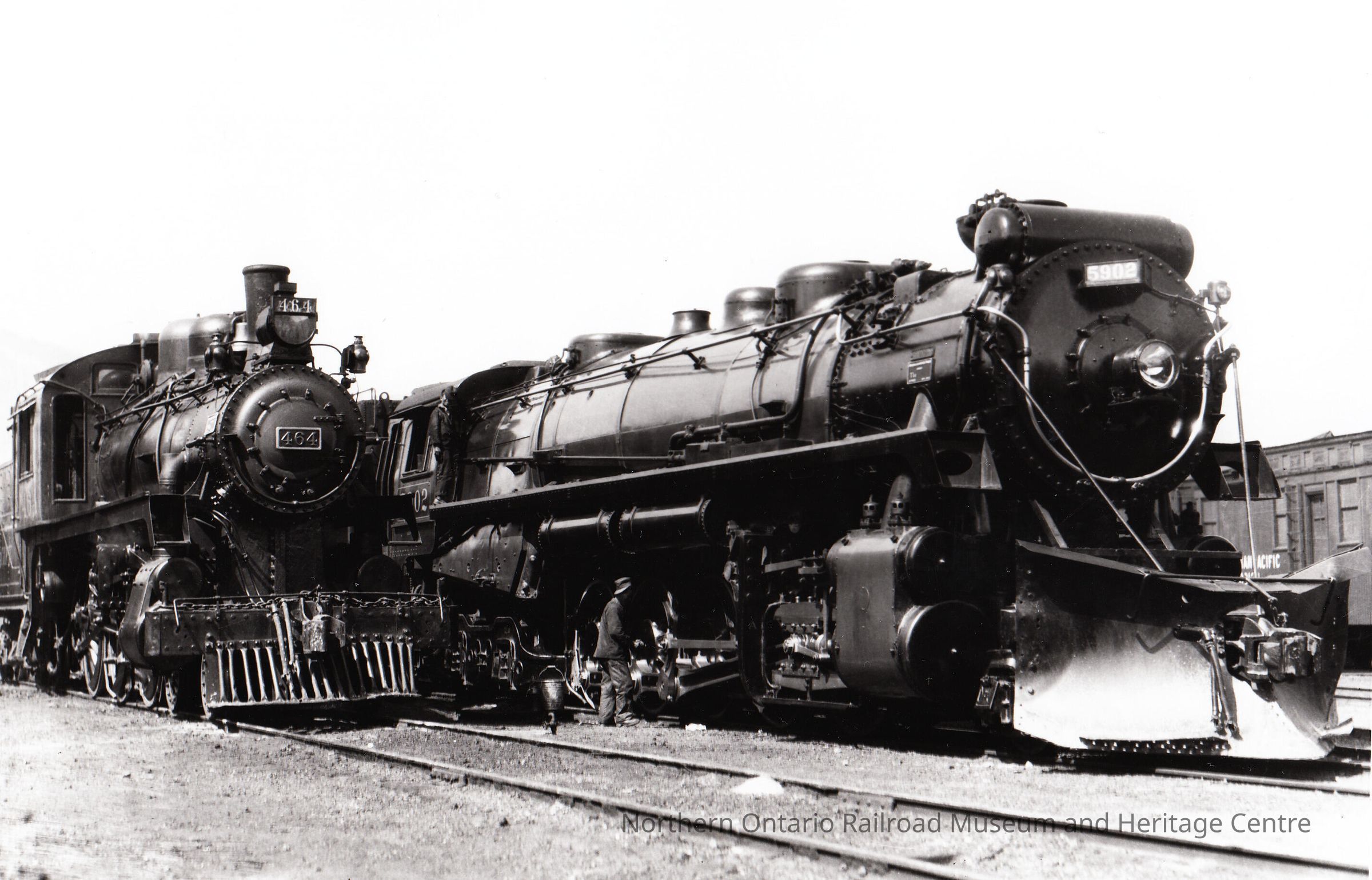Black and White- CNR Engines no. 464 and 5902 sit side by side in a rail yard.Collection