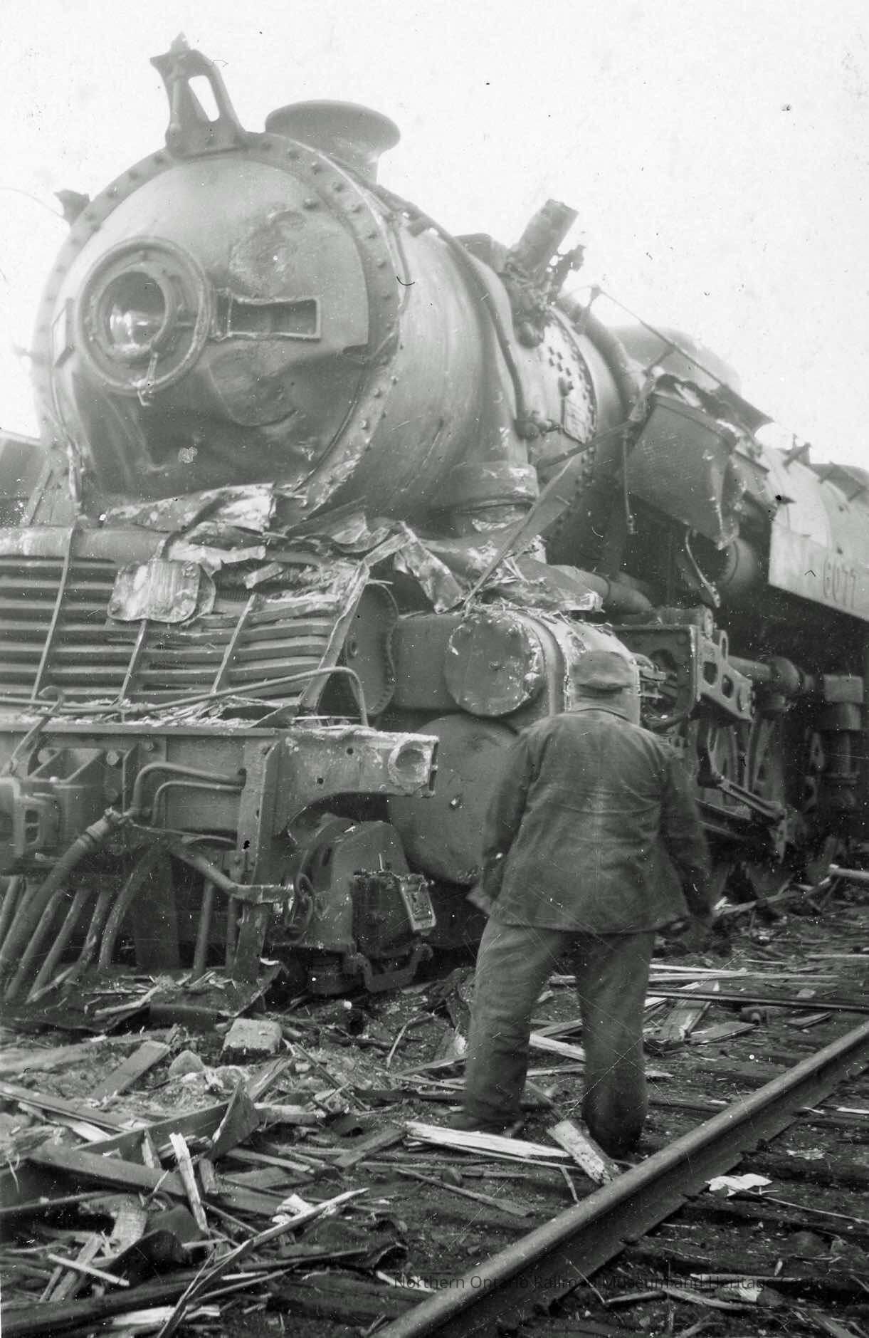 Photograph, CNR Engine 6077, Wreck in Capreol Yard, Engineer Alex Boyd, Fireman Rene Bazinet.Collection