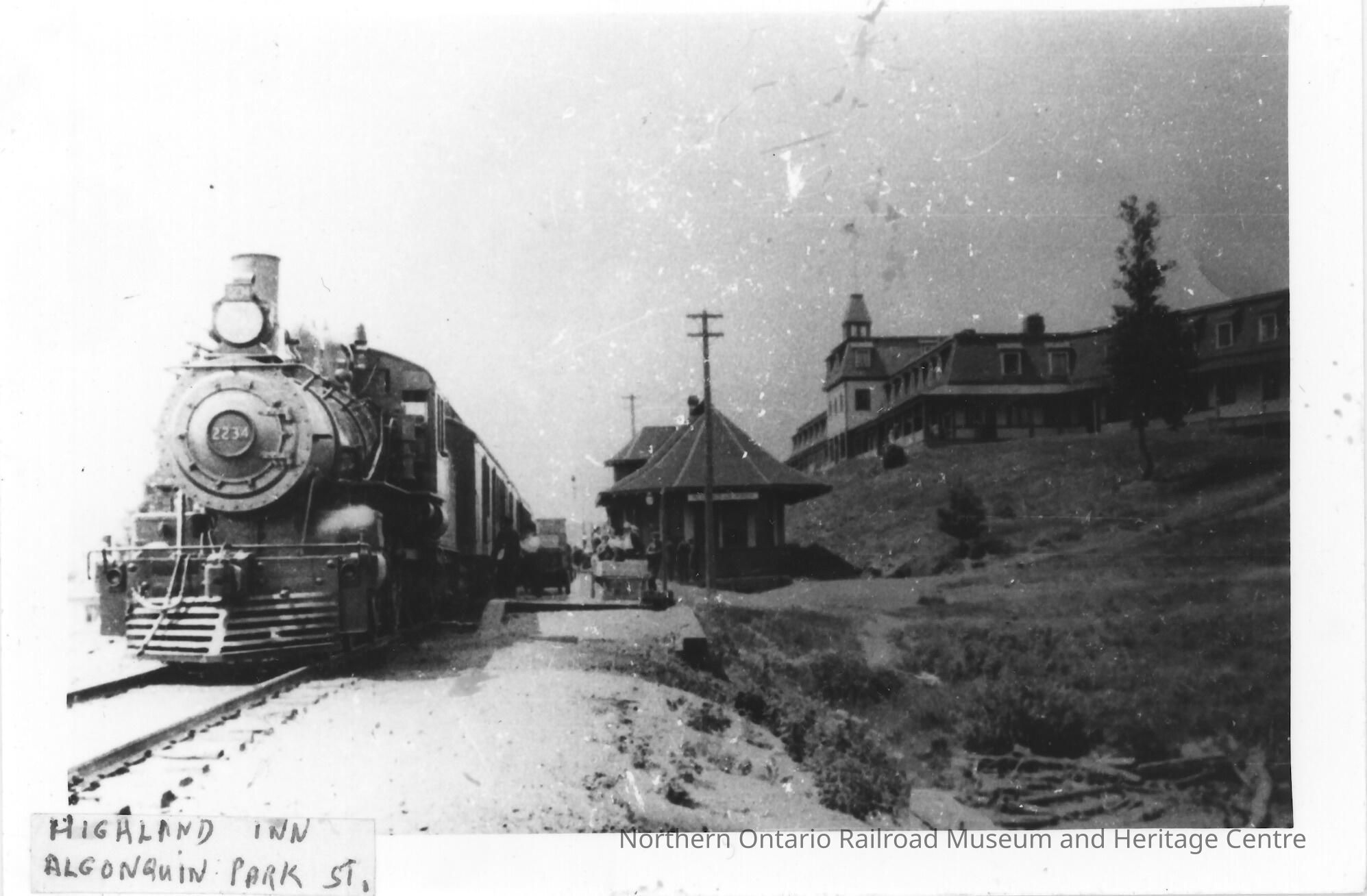 Photograph, CNR Station at Algonquin Park, Highland Inn. Steam Locomotive 2234.Collection