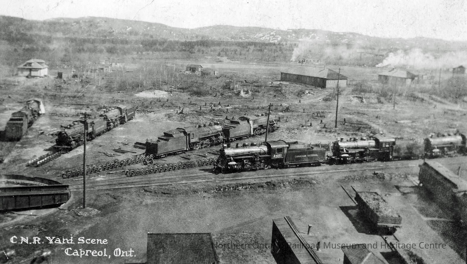 Black and white aerial photograph of the Capreol Canadian National Railways yard scene.Collection