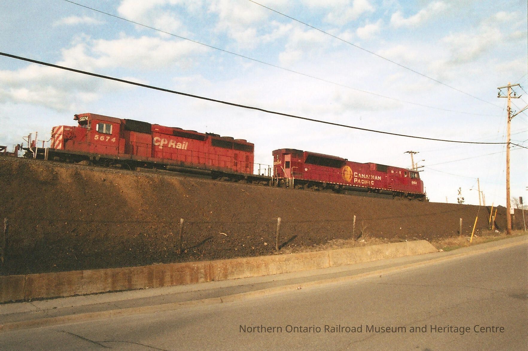 Colour photograph of CP Rail locomotive nos. 5674 and 9154 on the tracks. Photograph taken from below, on the street.Collection