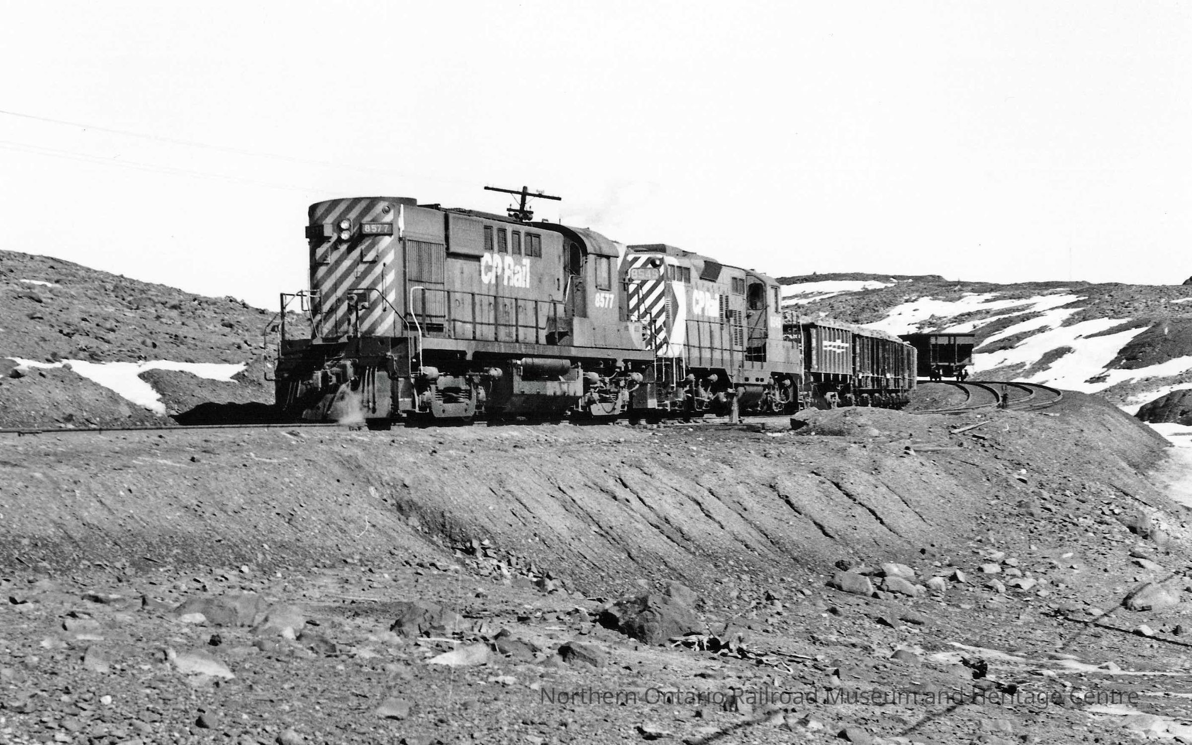 Black and white photograph of a CP Rail ore train. Locomotive no. 8577.Collection