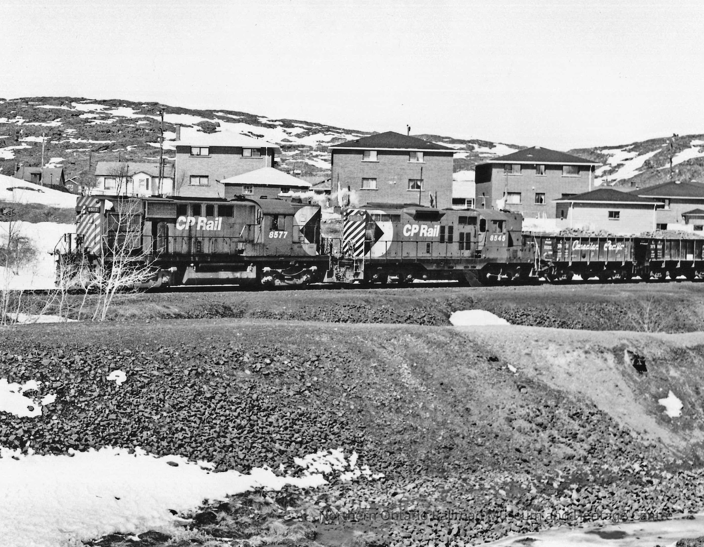Black and white photograph of a CP Rail ore train passing in front of houses. Locomotive nos. 8577 and 8545.Collection